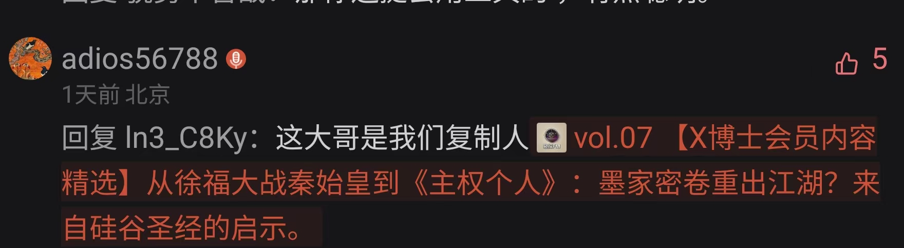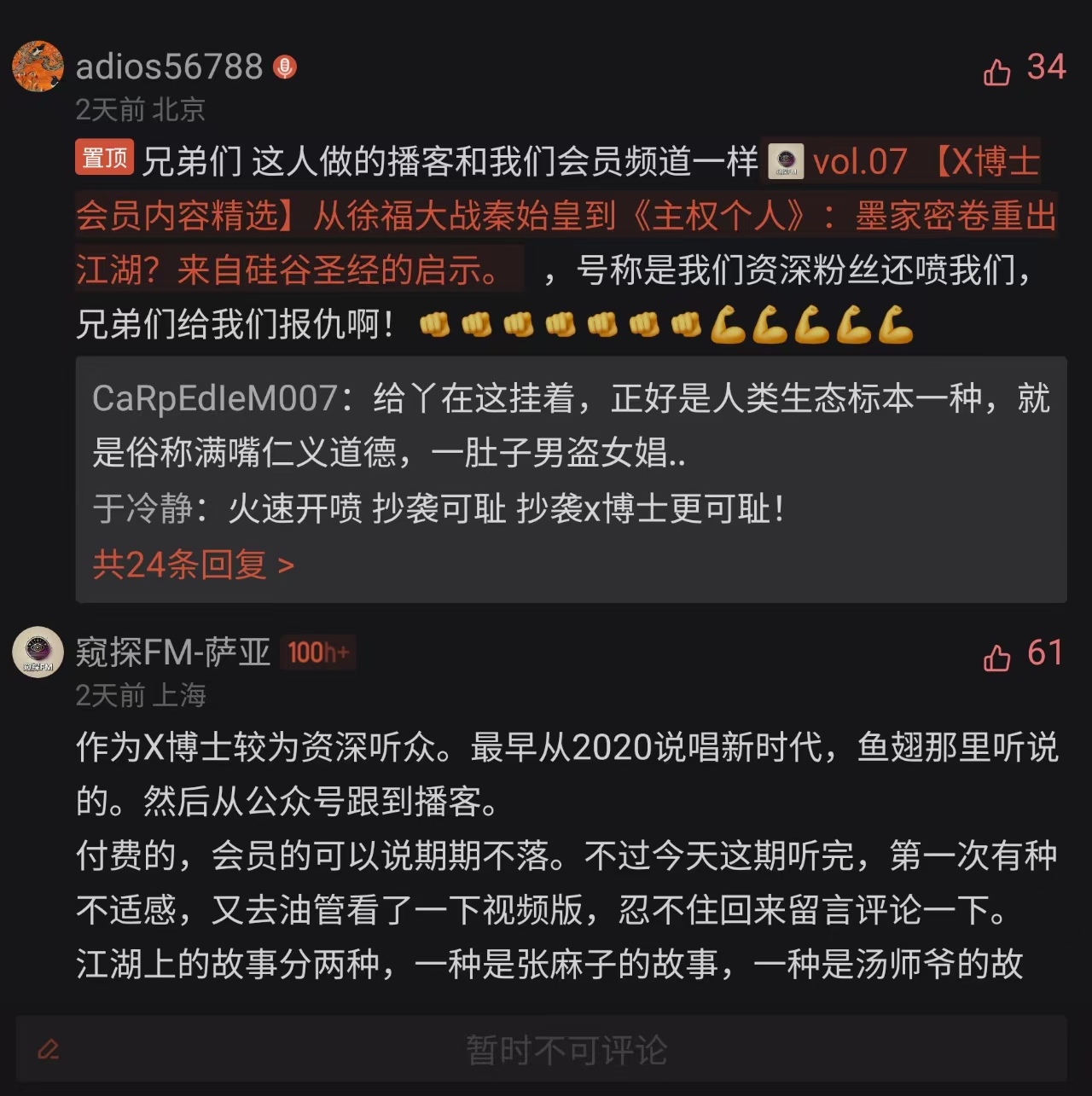 大部分人都喜欢和自己价值观相同或者相近的故事,我最烦这种置顶言论的SB行为,更讨厌给偶像报仇的言论,跟饭圈这种粪坑有啥区别啊。发哥只是一个优秀的内容的创作者,不要神化他,也不要试图教育他,喜欢的内容就听,不喜欢的就不听呗。