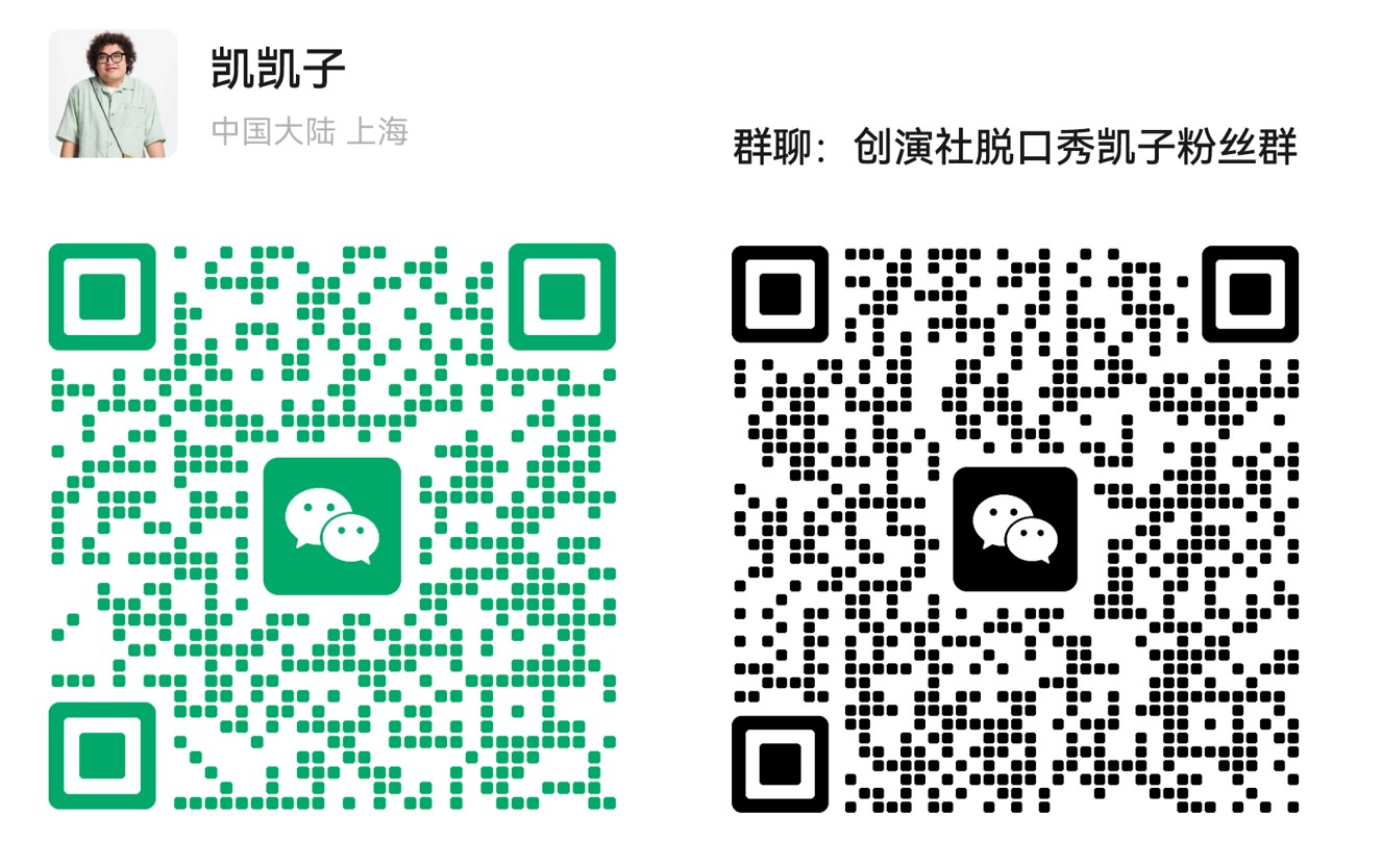 可以添加凯子的私人微信查看喜剧人日常,也可以加入凯子的内部喜剧社群,会发布喜剧工作坊,演出,公益的学习资料等内容。