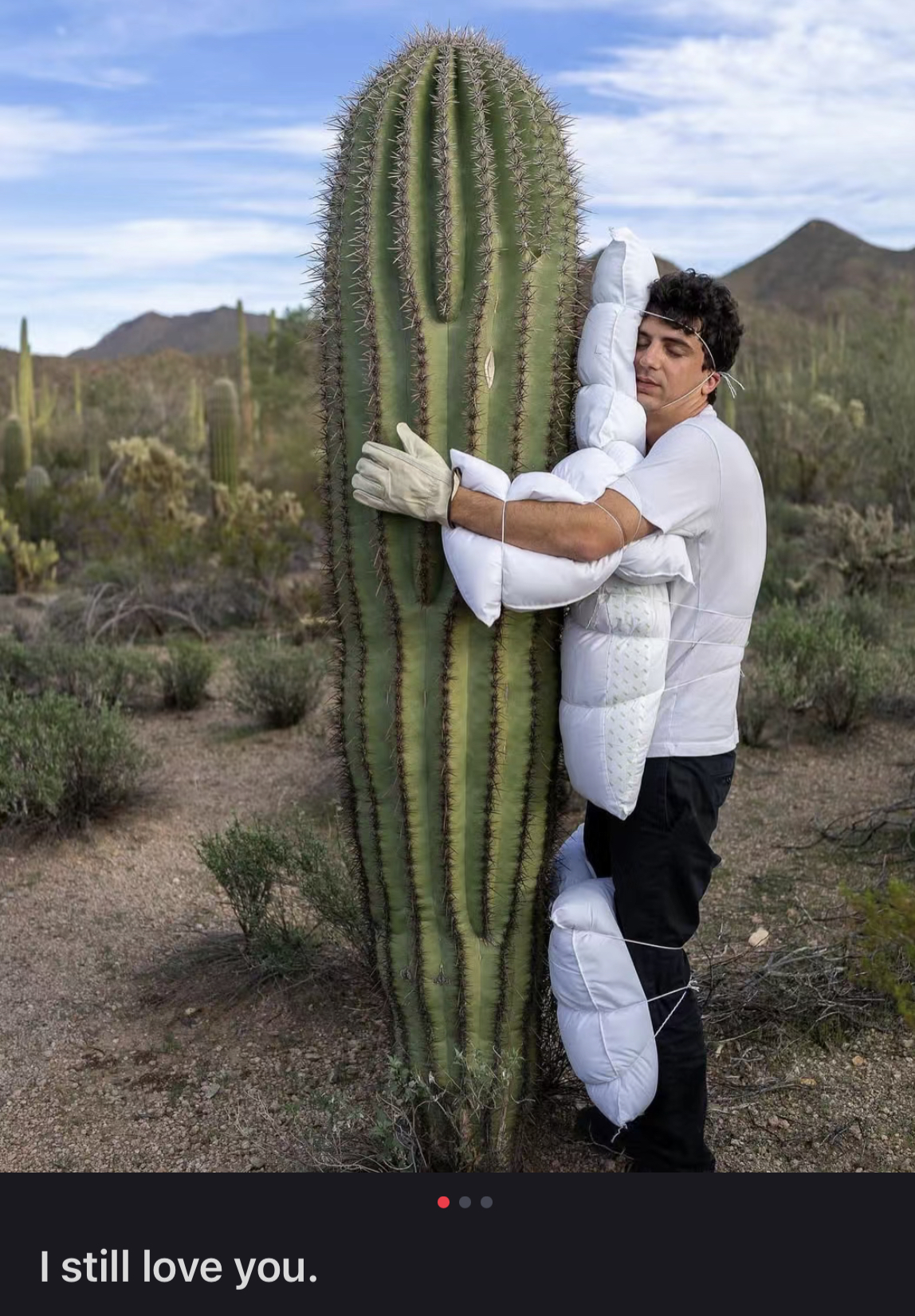 之前在一个行为艺术家的主页上发现了一张非常能够完美形容我在亲密关系中我的伴侣需要作为的一个形象,是一个人拥抱一株浑身是刺的仙人掌,为了继续拥抱它而全身上下绑满了枕头。即使你浑身是刺,爱你的人依然会坚定地爱你,拥抱你。