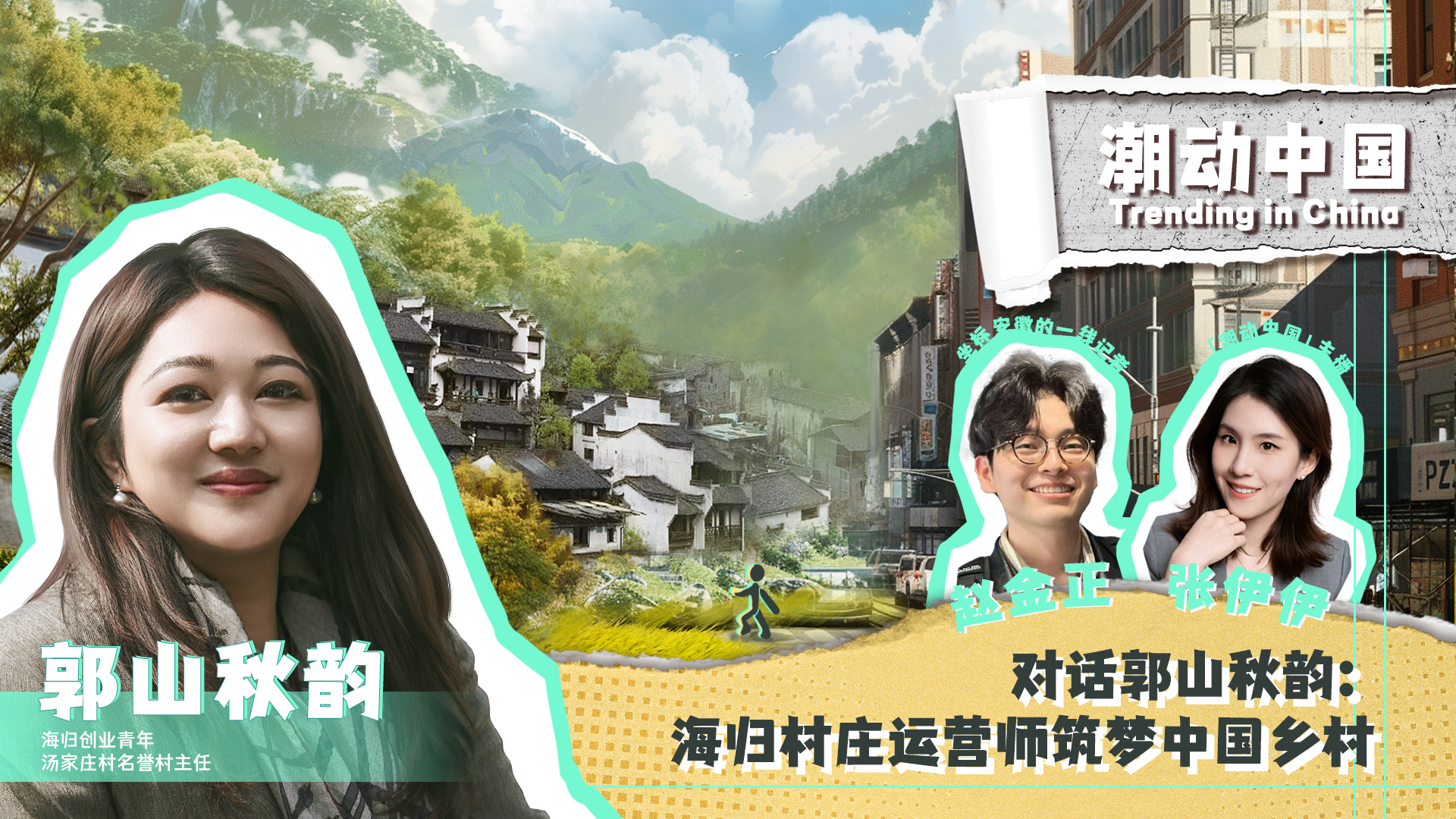 本集Trending in China 「潮动中国」继续对话郭山秋韵,一位筑梦黄山村庄的海归创业青年。她如何与黄山汤家庄村结下不解之缘?作为一名乡村运营师,又对乡村振兴怎么看?本期亦有特邀主播、坐标安徽的一线记者赵金正,带我们一道感受年轻人带来的乡村发展新活力。