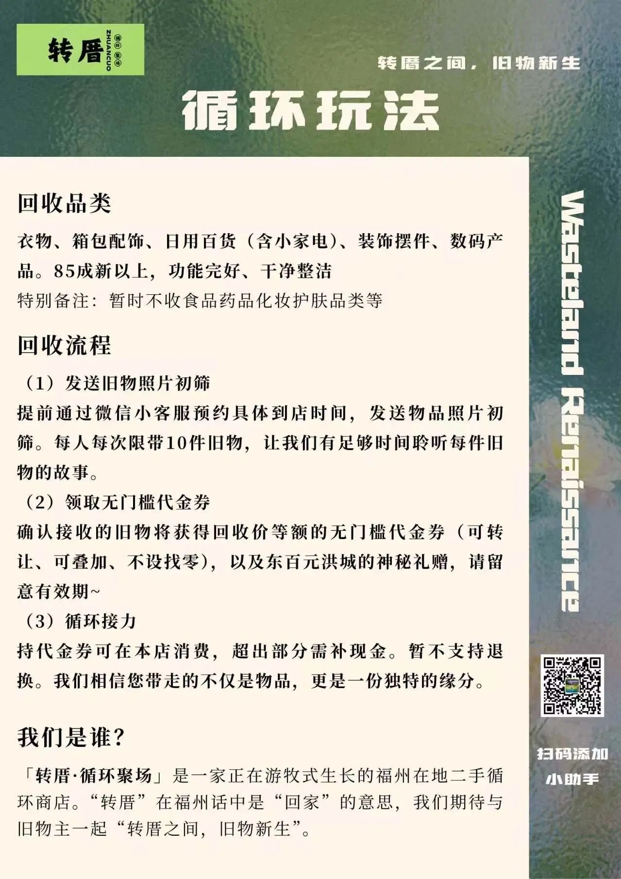 前不久,GoZeroWaste福州小队长Ivy开了一家专注于旧物循环的快闪店「转厝·循环聚场」!快闪店的商品自带“故事感”,大多数商品在标价之外,还附有一张写着“物品故事”小纸条,都是由前物品所有者亲手书写、带着温度的字迹。本期播客我们邀请到老板Ivy,借由采访和声音,与大家分享「转厝」背后的故事。