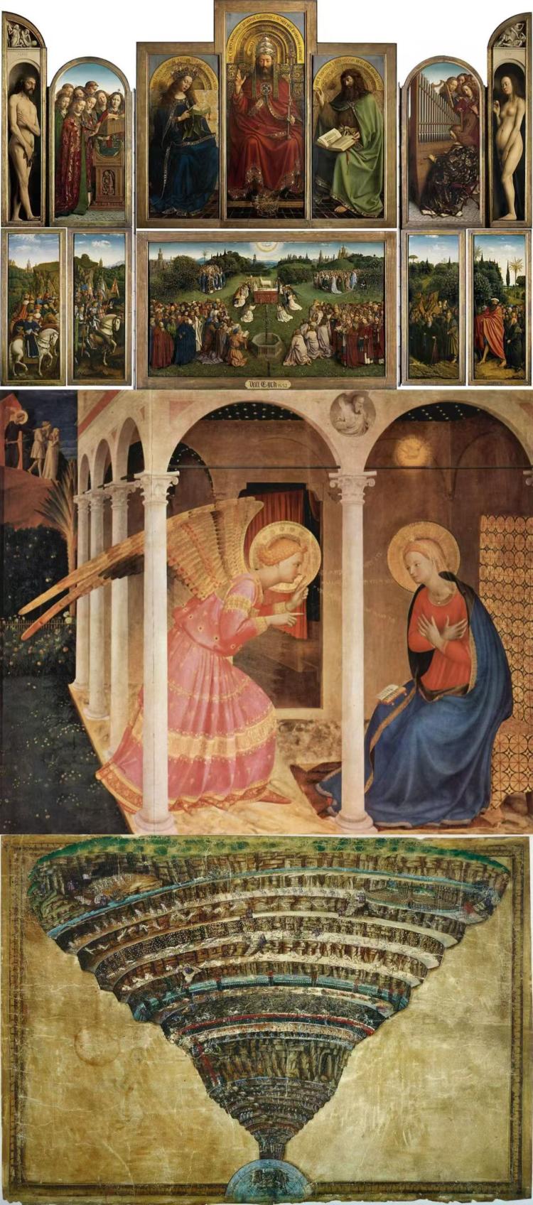 图为:《神秘羔羊祭坛画》中的伊甸园;圣母和“闭锁的园”;波提切利描绘《神曲》中的地狱