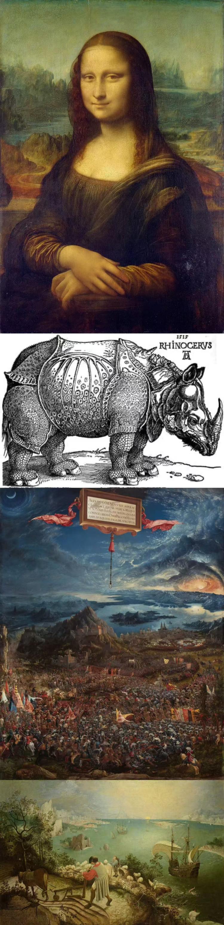 图为:《蒙娜丽莎》;丢勒的《犀牛》;《伊苏斯之战》;《有伊卡洛斯坠落的风景》