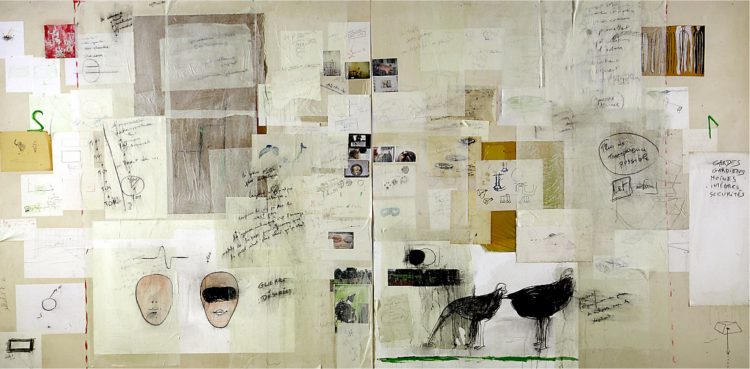 3)《宝藏》作为展览的封面作品,《宝藏》以一棵苹果树为中心,描绘苹果坠落地下转化为樱桃、周围则埋藏着金币、树状细胞、解剖图与文字图像。它所描绘的“宝藏”不是金银珠宝,而是一个由土壤、水分、细菌、种子与知识交织而成的复合生态系统。伊贝尔在采访中说,真正的“宝藏”,是“生长的潜力”。