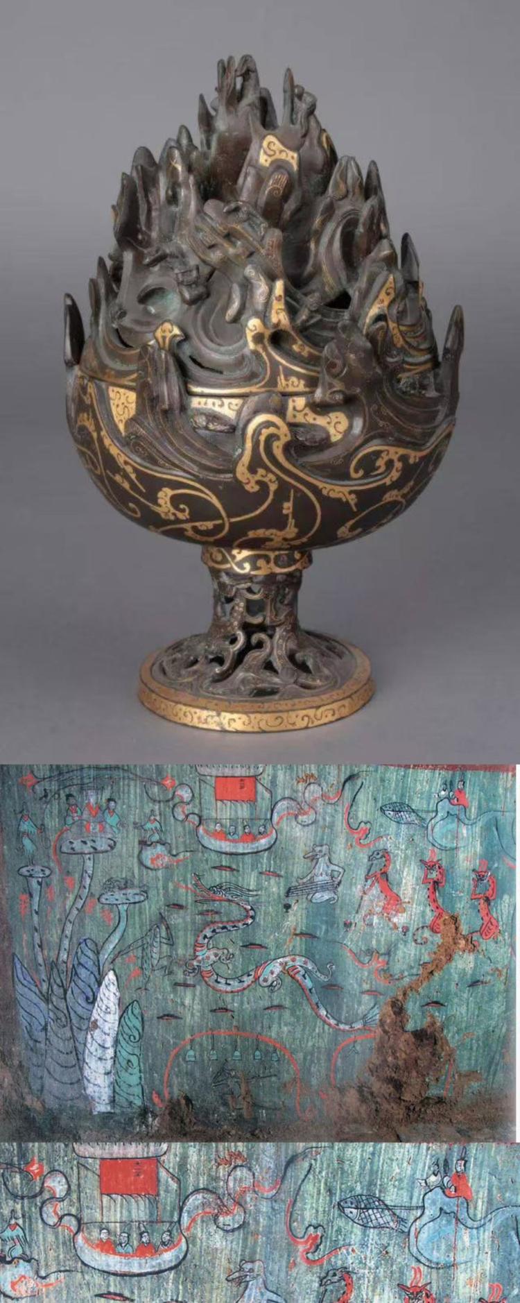 图为:1968 年出土于河北满城陵山中山靖王刘胜墓的错金熏炉;陕西定边郝滩壁画墓《拜谒西王母乐舞图》