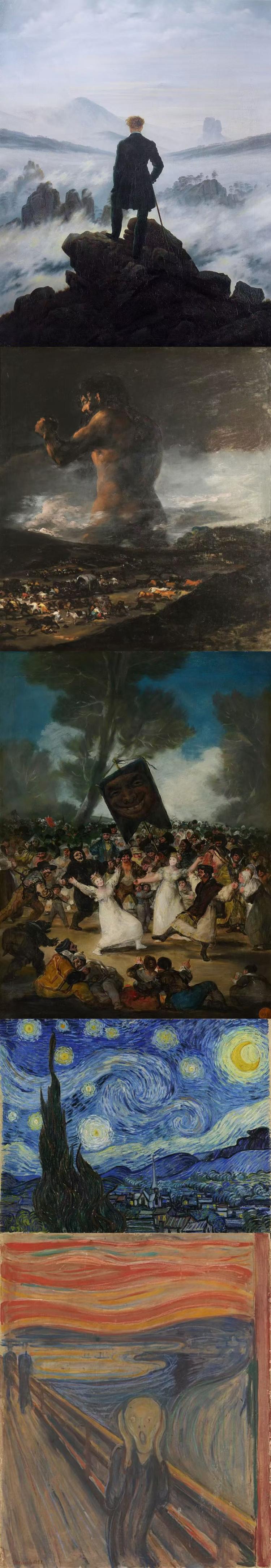 图为:弗里德里希《雾海上的游荡者》;戈雅《巨人》、《沙丁鱼葬礼》;梵高《星月夜》;蒙克《呐喊》