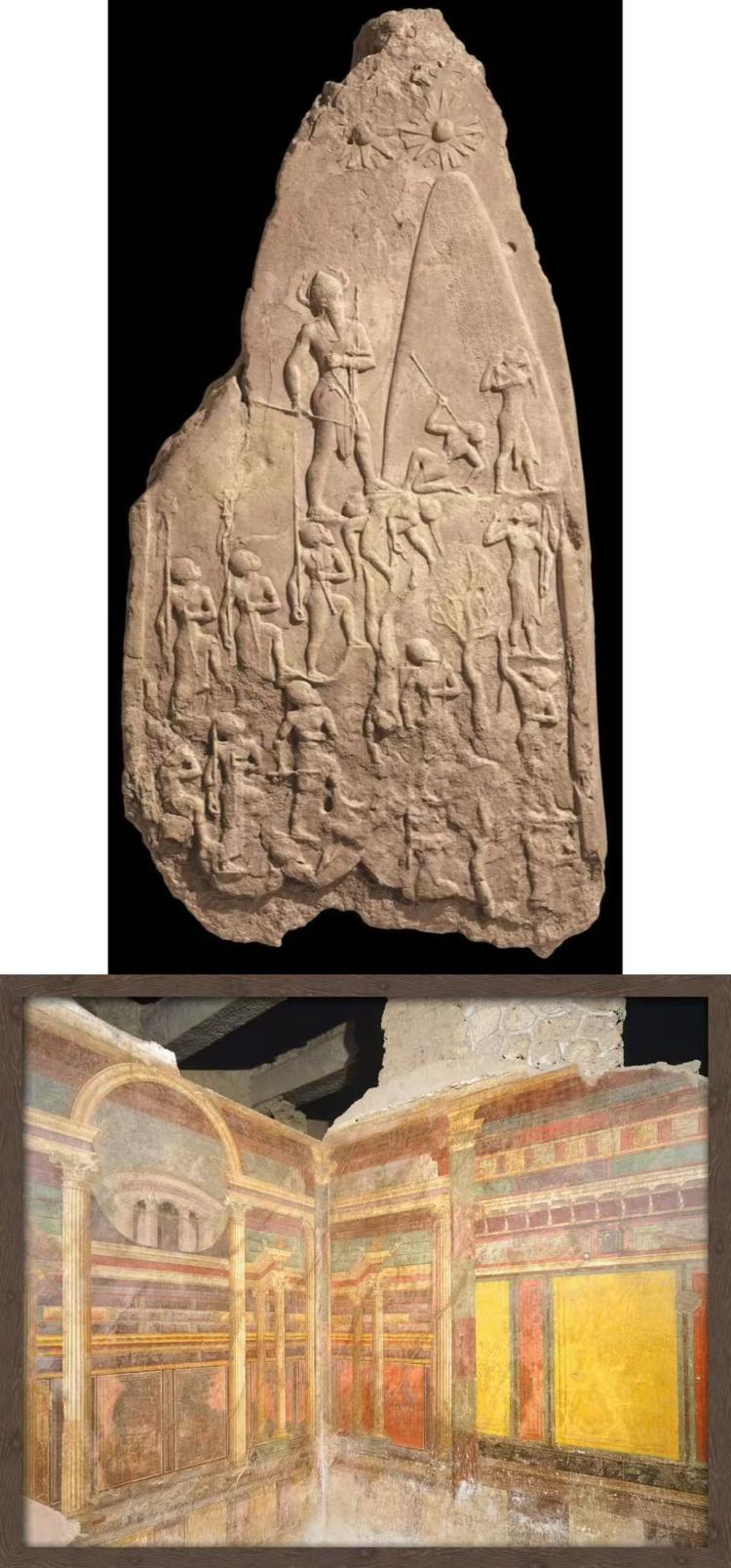 图为:美索不达米亚的纳拉姆辛纪功碑;庞贝壁画幻觉类型的景观