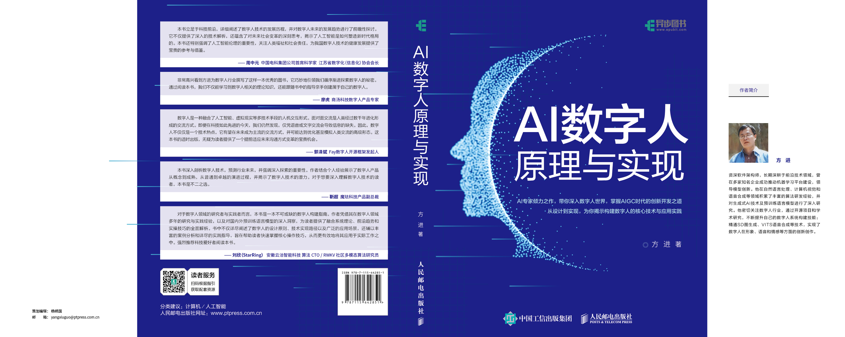 方进(就是本人啦)撰写的《AI数字人原理与实现》是一本关于人工智能数字人技术的专业著作。该书系统介绍了数字人的定义、发展历史、关键技术(如视觉算法、语音合成、语义理解)和应用领域,并探讨了创作流程、身份认知和技术规范等前沿话题。书中包含丰富的案例分析和实践经验,为读者提供了从理论到实践的全面指导。此书适合对数字人技术感兴趣的研究者、开发者、从业人员及爱好者阅读,并得到多位行业专家的赞誉。