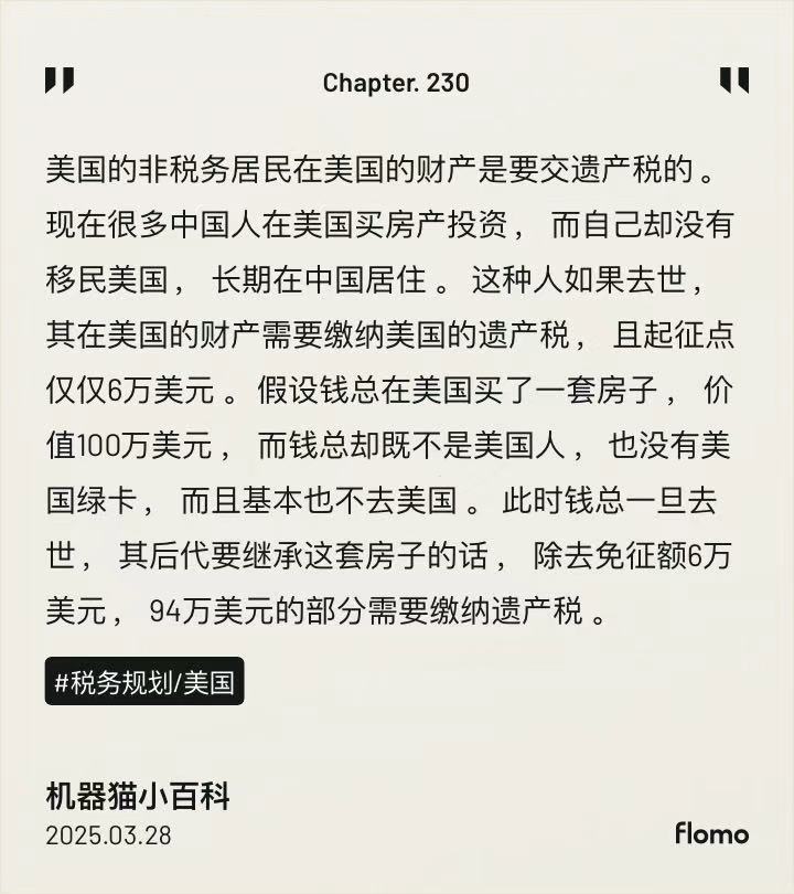非税务居民父母若留美房产给已移民的子女,需注意:①中国内地资产无需缴美国遗产税,但子女需申报IRS Form 3520;②在美房产超6万美元部分按40%征税。