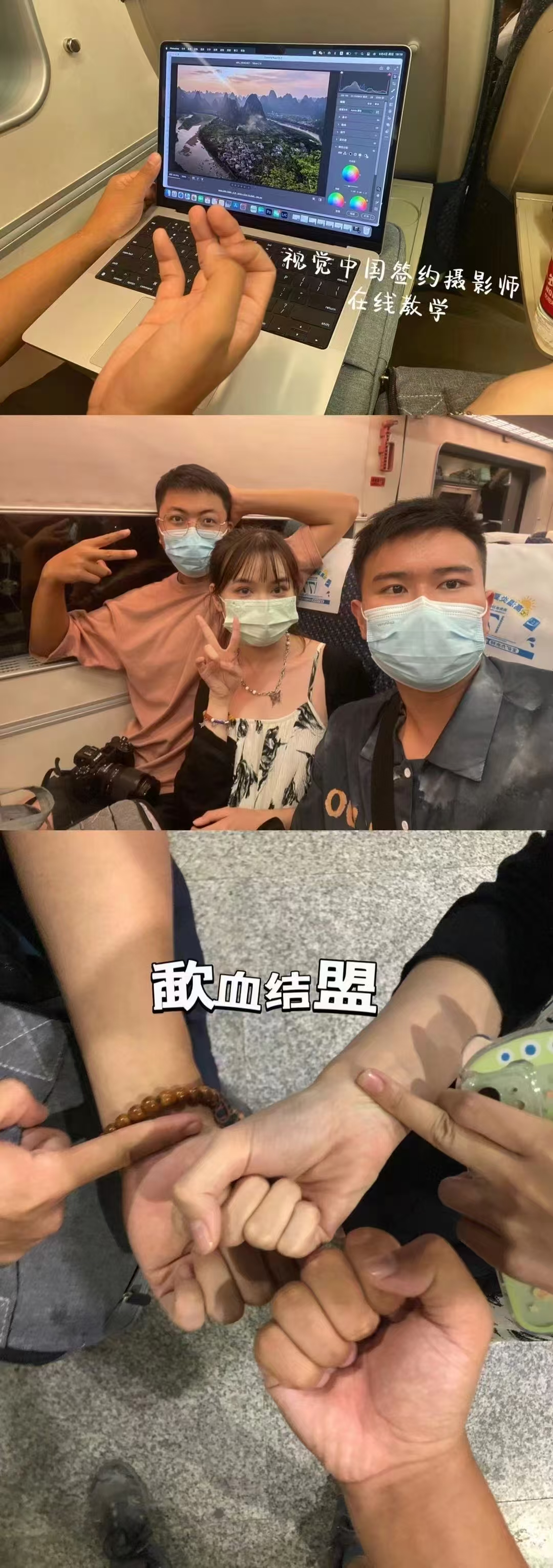 在高铁上三人留下第一张合照,并且马上就“歃血为盟”!
