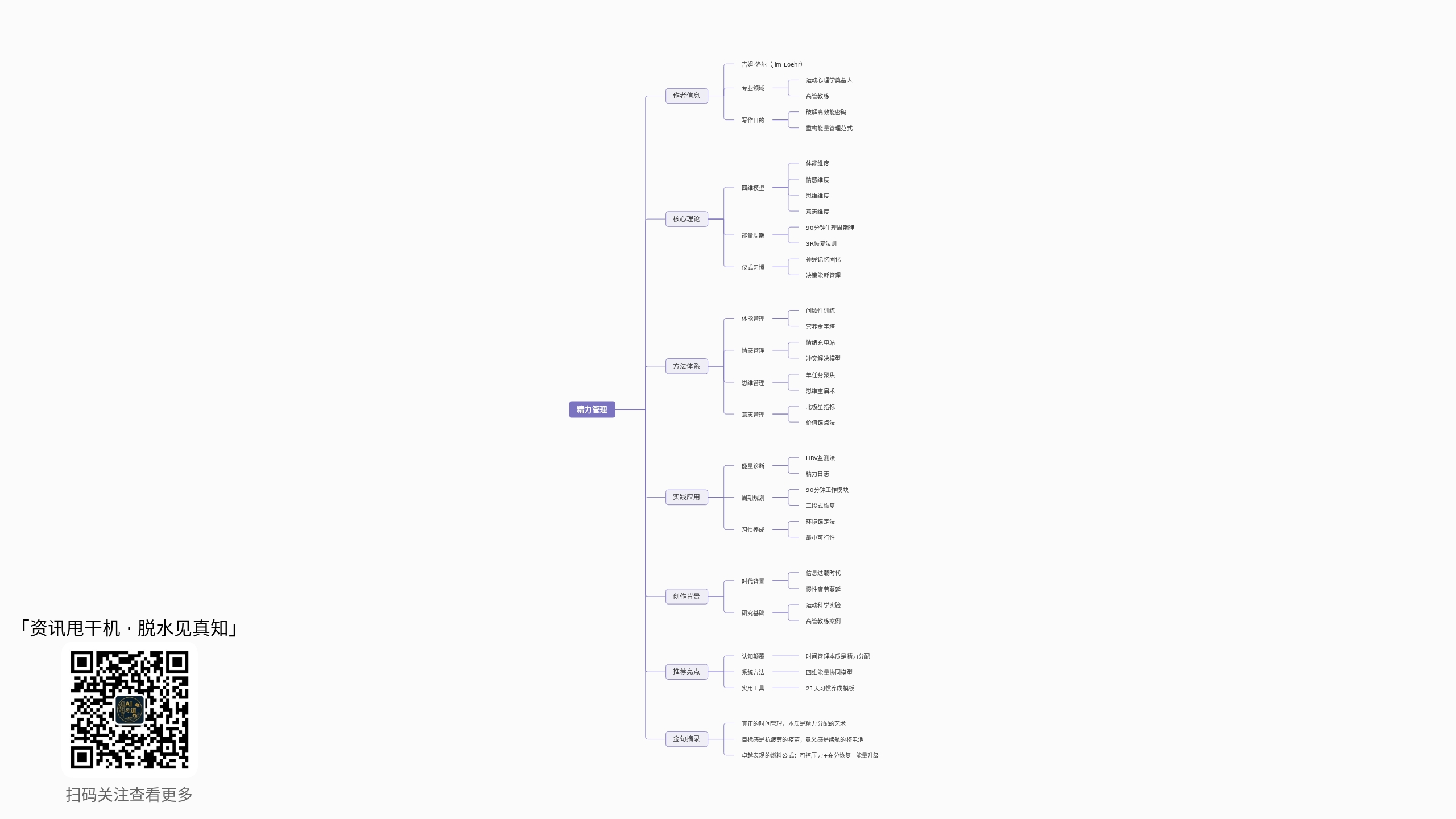 书中构建了科学的精力管理体系,包含四个相互关联的维度: 1. 体能维度(物理基础):揭示了70%的精力波动源于身体状态。通过呼吸训练、间歇性运动、营养管理等提升基础代谢率 2. 情感维度(能量引擎):正负情绪消耗的能量差可达3倍。建立「情感储蓄账户」需要主动创造积极体验 3. 思维维度(认知资源):专注力呈现U型曲线特征,需通过单任务模式与思维重启保持高效产出 4. 意志维度(价值驱动):目标感缺失会导致30%以上的隐性精力损耗。明确「北极星指标」是持续投入的关键