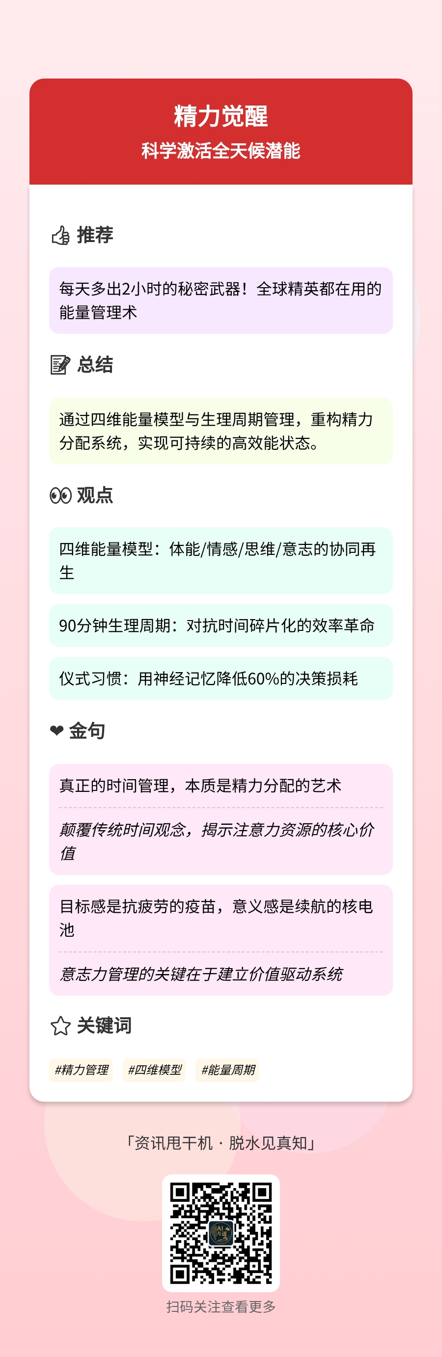 - 精力再投资意识:认识到达成目标后的精力溢出效应,需主动进行能量更新