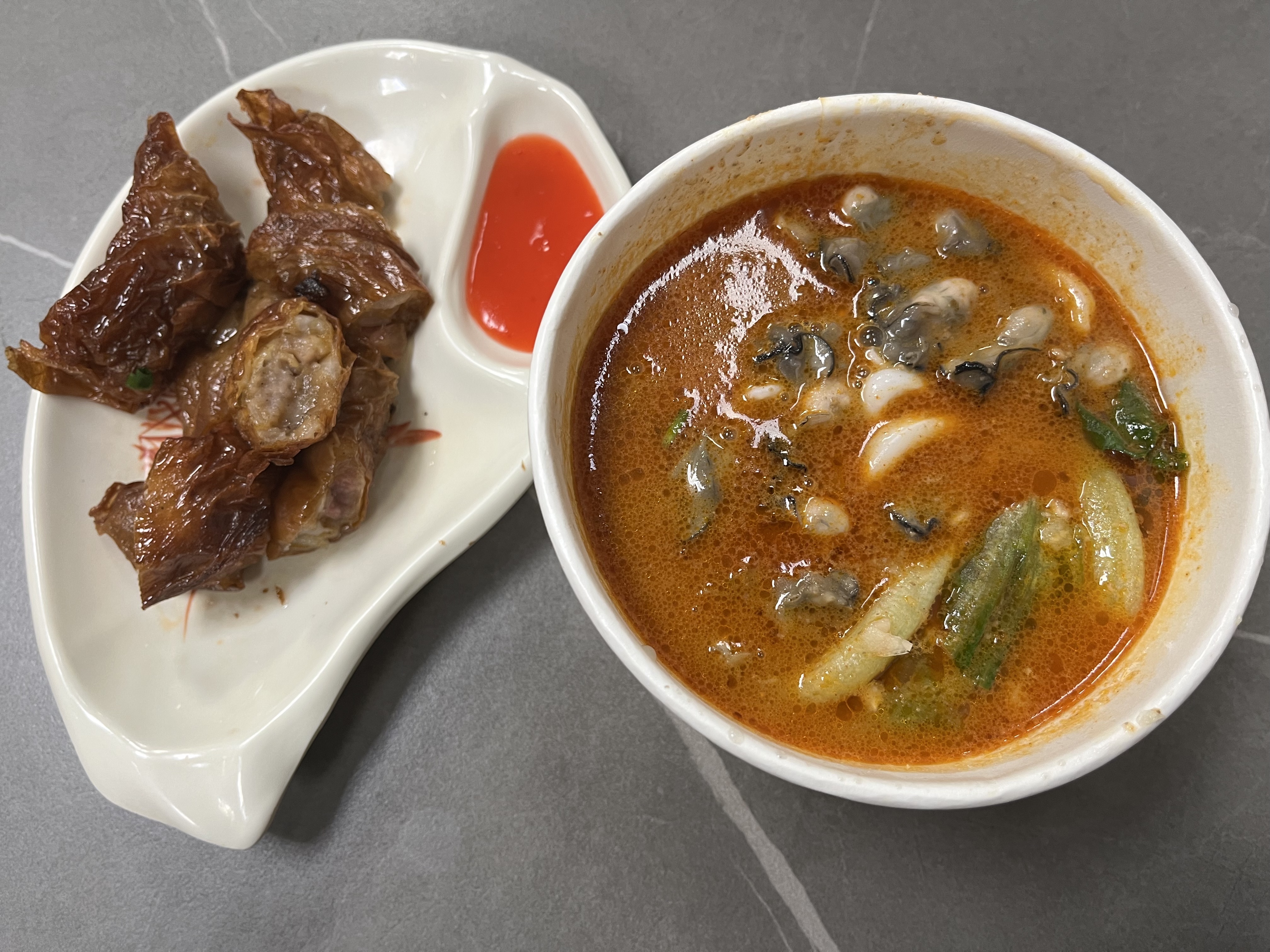 11.一份加了鱿鱼和海蛎的沙茶面、一份叫“石码五香”的小吃