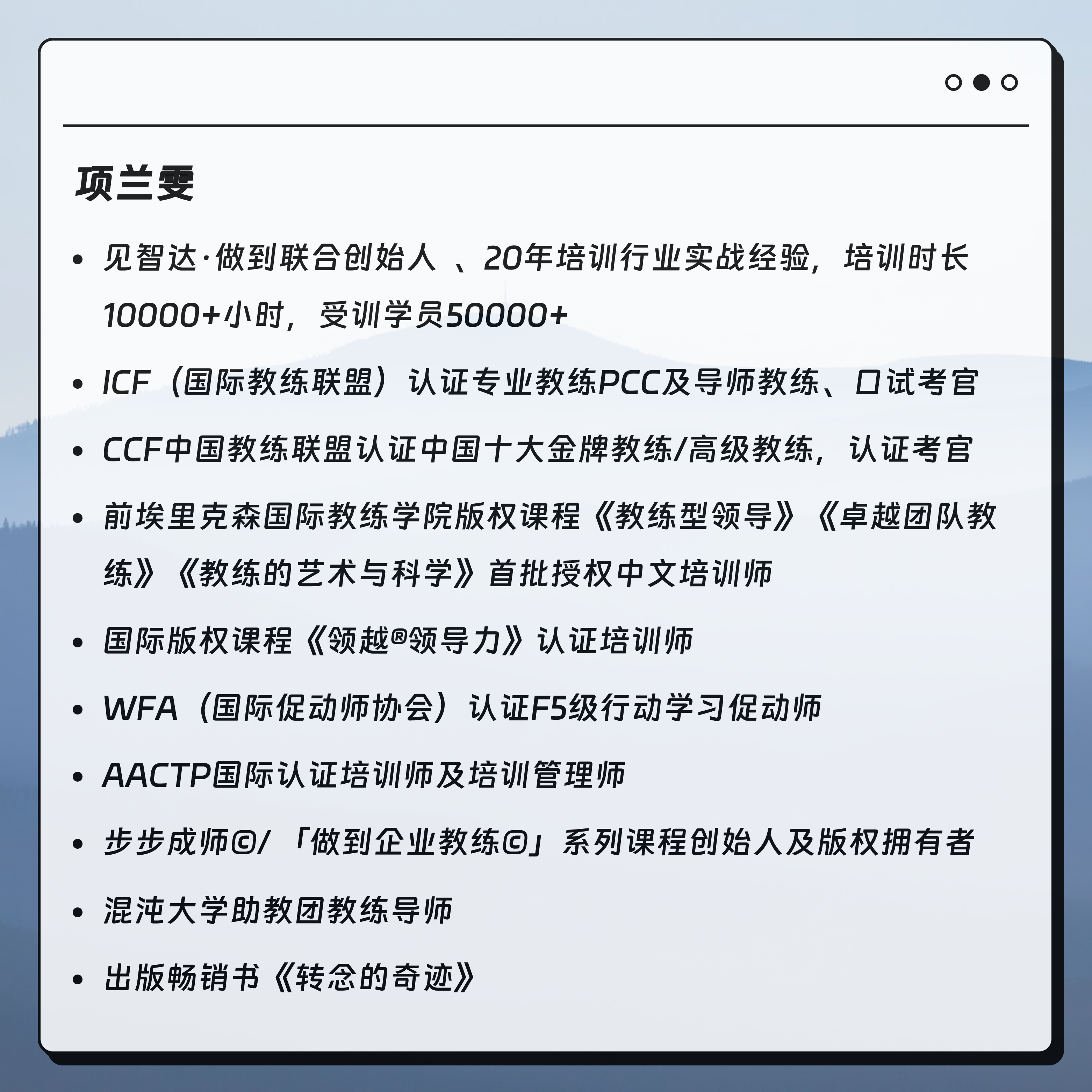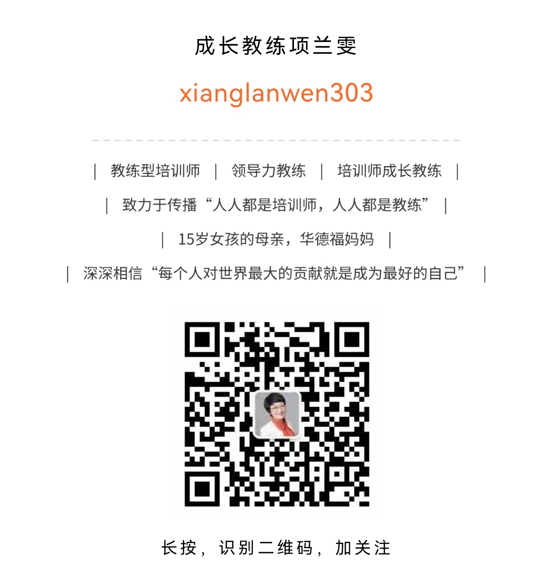 今天的聊天对象是我学习教练路上教我的老师——项兰雯女士,在学习教练之前,我几乎没有接触过社会上的商业培训师,而兰雯老师不仅是 PCC 教练、教练认证考试考官、作家、更是一位有着 20 年经验的培训师,在她的课上你总能感受到热情、新意和活力,似乎在欢笑和体验中,知识防不胜防的进入了脑子里,就这么不费吹灰之力的我好像会了,作为一个从小就喜欢跟老师叫板有点反骨的学生,我实在是好奇,面向成年人的商业培训师到底怎么上课?他们在热爱什么?以及在教育和商业的交叉点里,怎么获得身心合一的平衡。