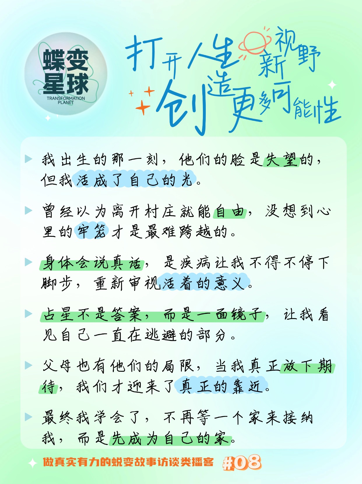 本期《蝶变星球》邀请沐心方分享她如何从不断重复的家庭情感模式中,勇敢走出,告别情绪的枷锁。从一名大厂精英转型为占星咨询师,她借助星盘的洞见重新理解了自己与家人的关系,找到了真正的内在力量,也重新定义了“家”的意义。无论你正困于家庭牵绊,还是在人生十字路口迷茫,这期节目都能带来一份温柔而清醒的启示。
