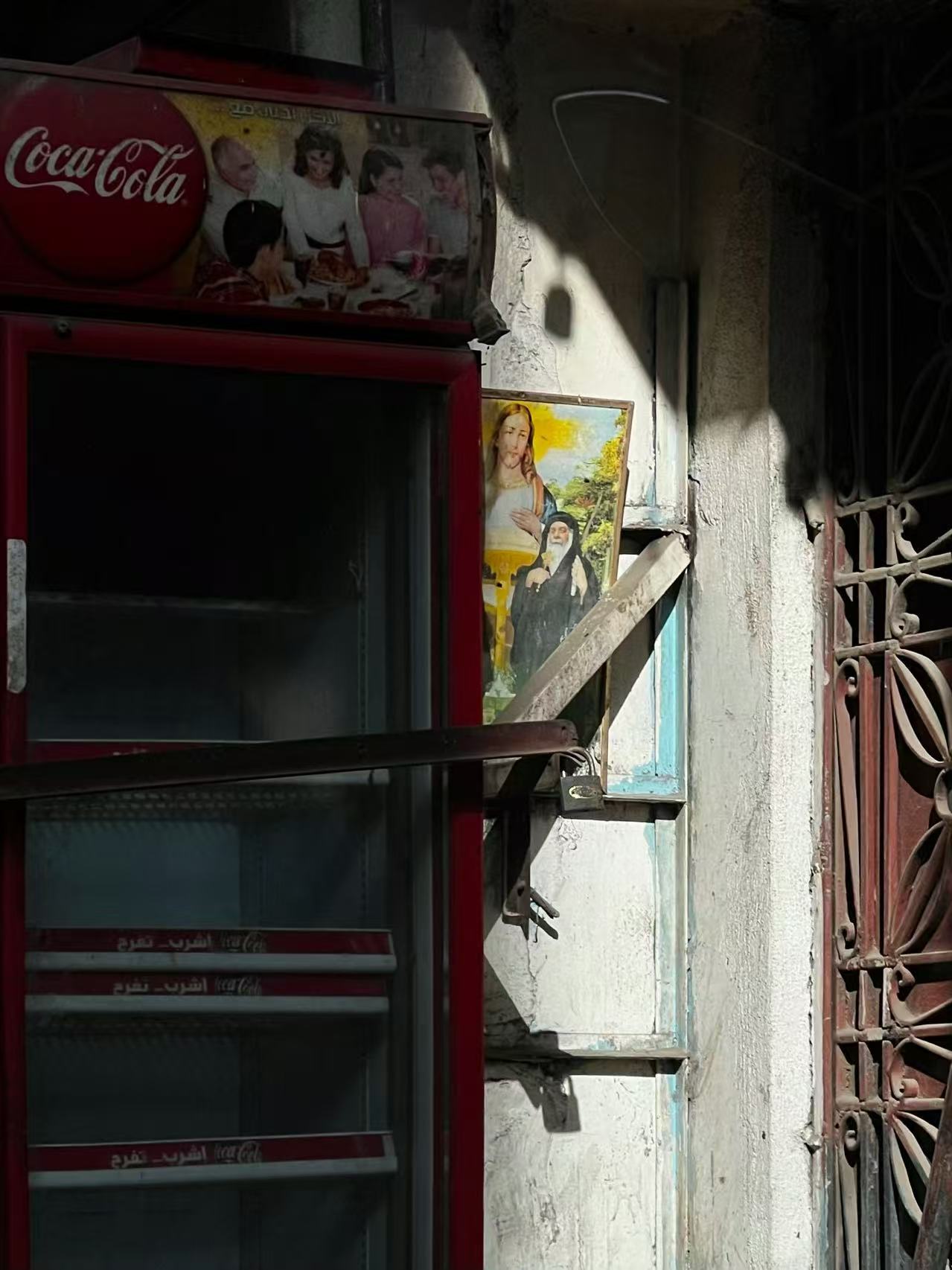 *穆卡塔姆村街道旁的二层窗户,破损的楼房被居民精心刷上红框,并绘制了十字架