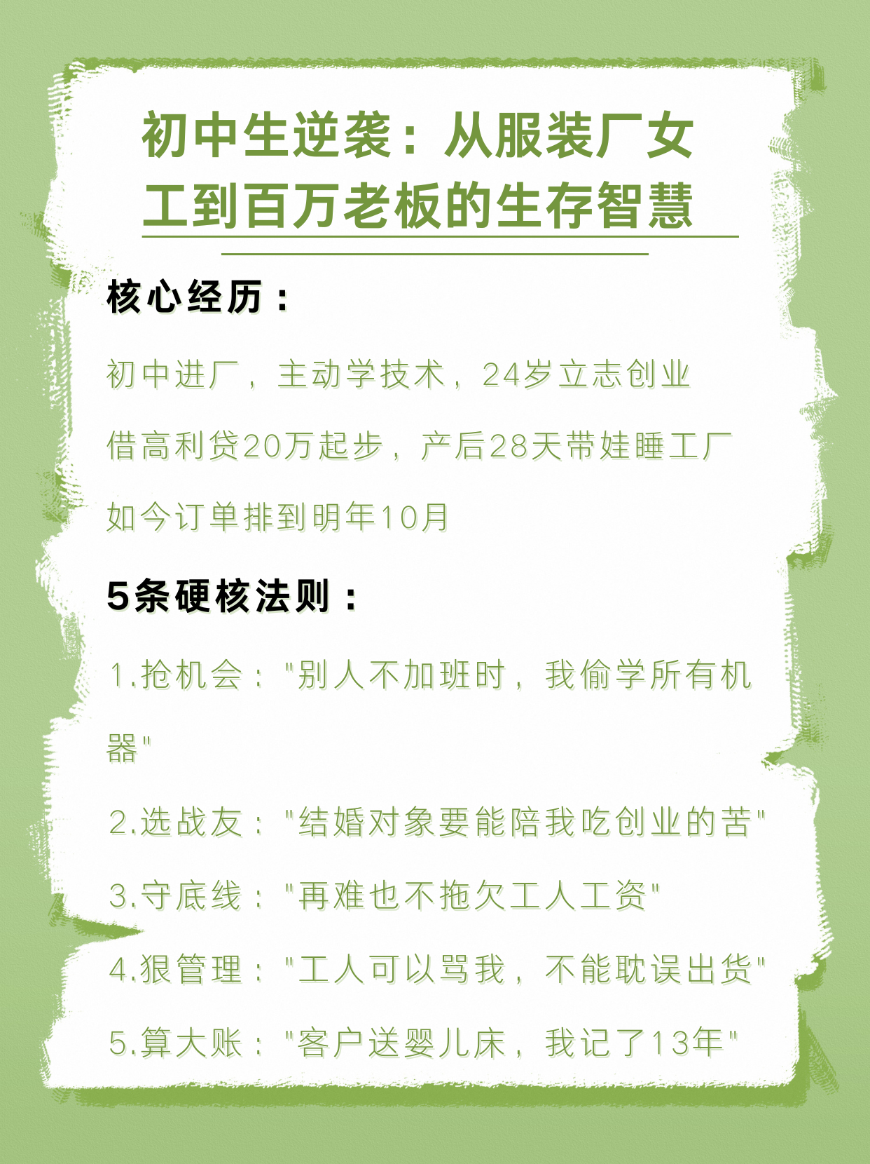 从19岁服装厂流水线女工,到如今经营服装加工厂,这位女老板用时间诠释了什么叫"草根智慧"。她曾为学技术给师傅孩子买银手镯,也曾产后28天带着婴儿睡在工厂泡沫垫上;她靠2400元和高利贷起家,却坚持"宁可自己饿着也不欠工人工资";她脾气火爆到能当场开除员工,却又因半夜救下煤气中毒的工人被记了一辈子。文章没有鸡汤式说教,只有扎心的生存法则:为什么"婚姻要选能陪你吃苦的人"?怎么做到"让工人骂你但死心塌地跟你干"?当老客户主动预付20万救急时,她到底做对了什么?这段充满汗味和机油味的创业史,或许能给所有不甘平凡的普通人一个最朴素的启示——成功不是打败别人,而是活成自己敢想却不敢做的样子。