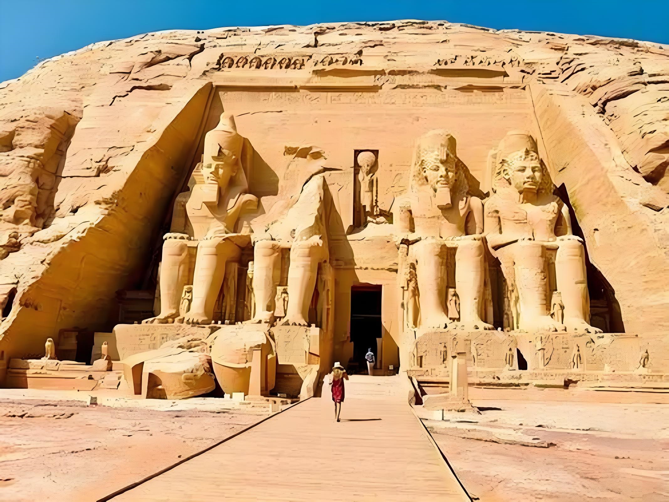 阿布辛贝神庙是古埃及神庙建筑的另一个显着例子。这座神庙建于公元前 13 世纪,由法老拉美西斯二世建造,位于现代城市阿斯旺附近。这座神庙以其巨大的拉美西斯二世雕像而闻名,这些雕像守卫在神庙的入口处。寺庙的正面装饰着精美的雕刻,描绘了法老在战斗中的胜利,以及场景出自埃及神话。