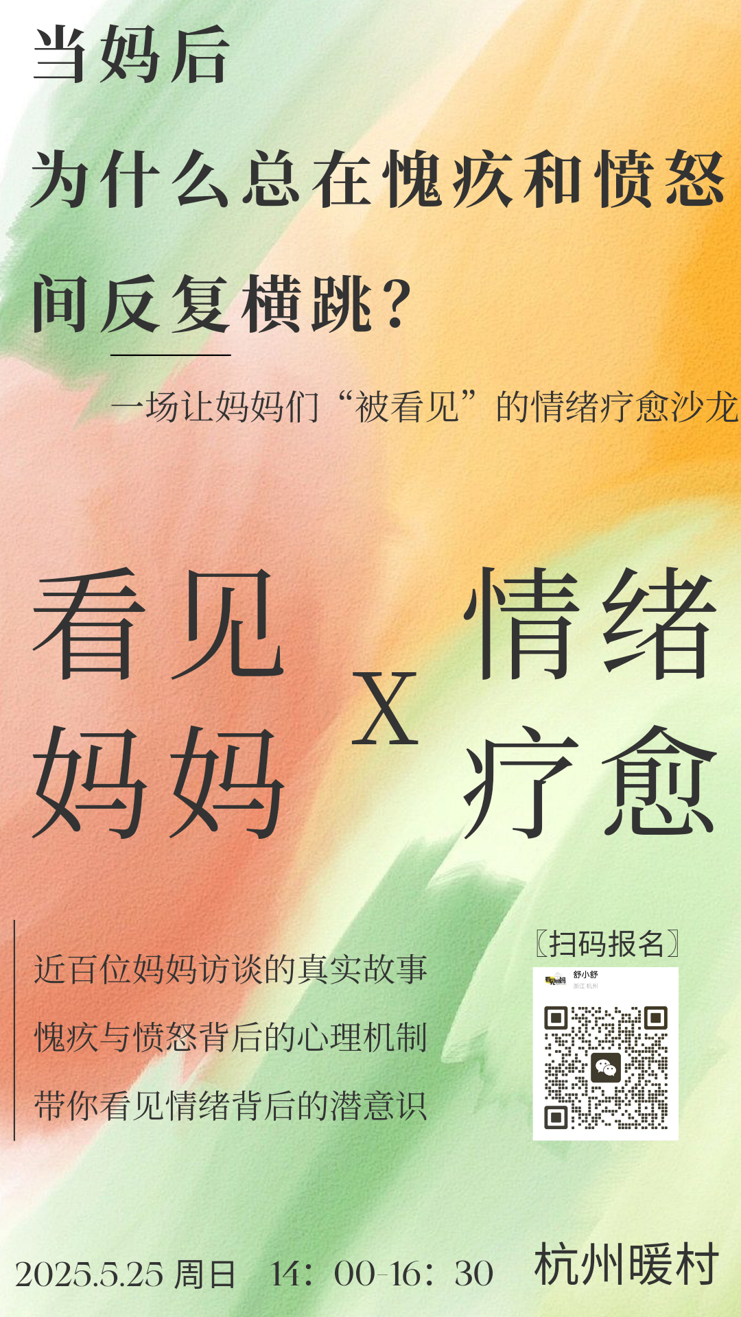 - 主题:当妈后,为什么总在愧疚和愤怒间反复横跳?——一场让妈妈们“被看见”的情绪疗愈沙龙