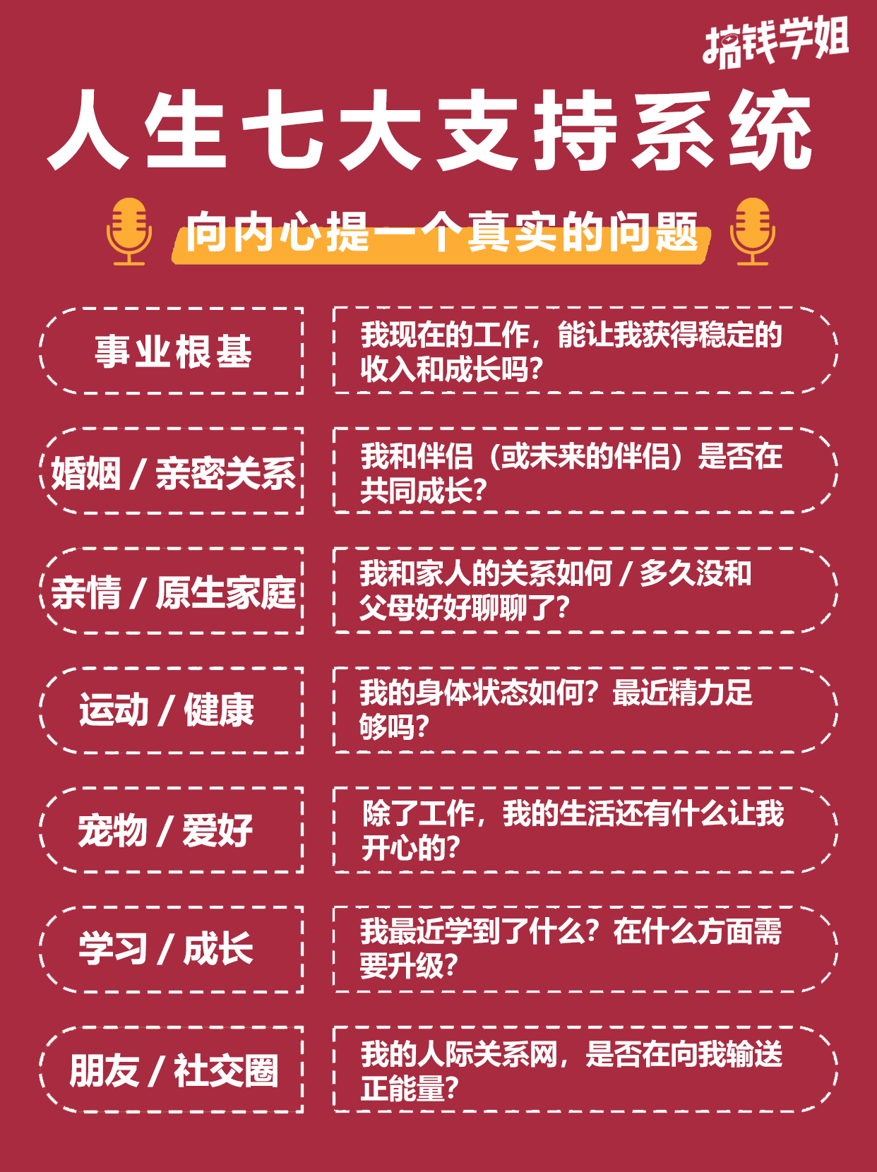 听完这期播客后,你给「自己的7个支持系统」打多少分?(事业 / 婚姻 / 亲情 / 朋友 / 身体 / 学习 / 宠物)