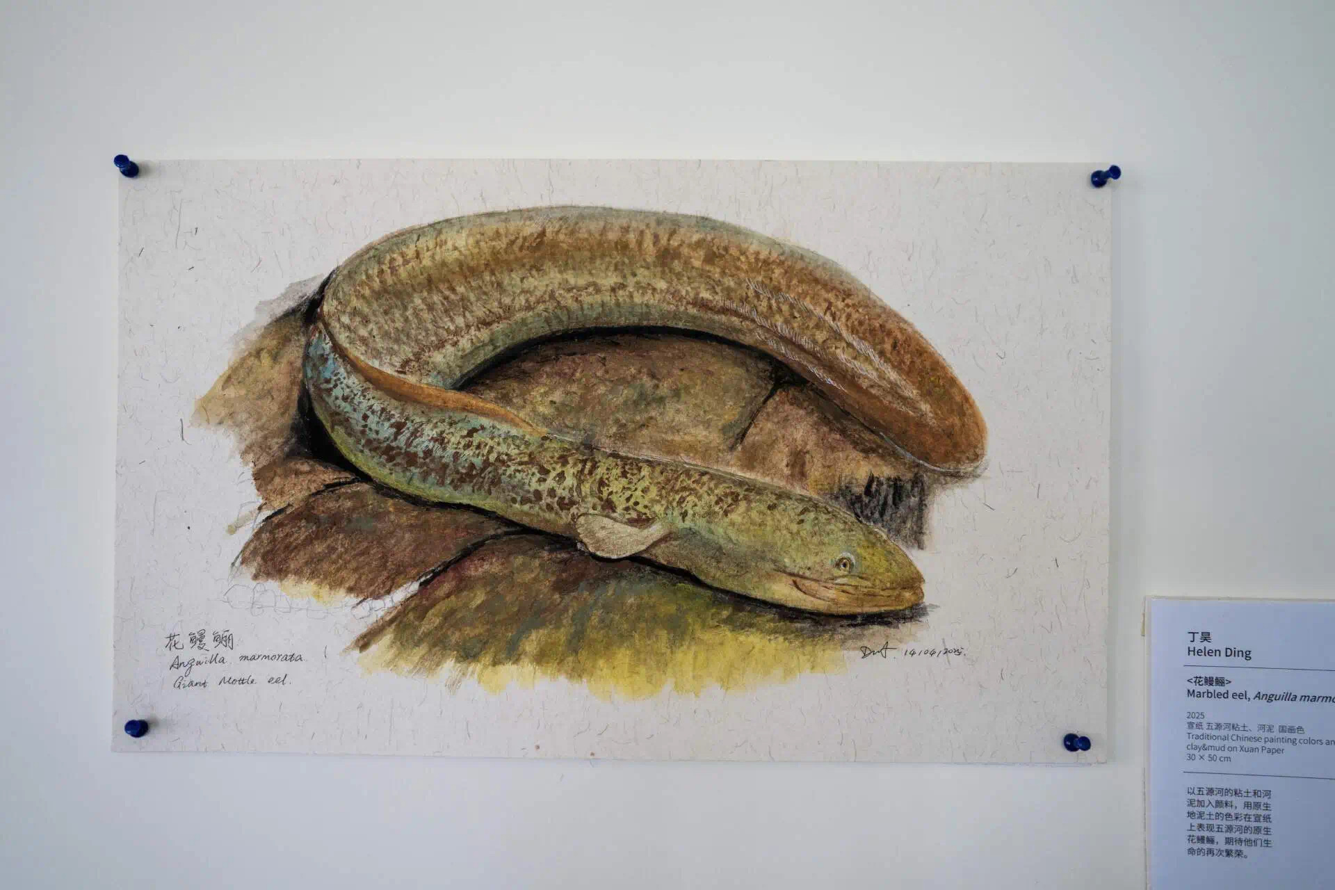 在五源河艺术季期间,生态插画师 Helen用色粉绘制的花鳗鲡绘画。
