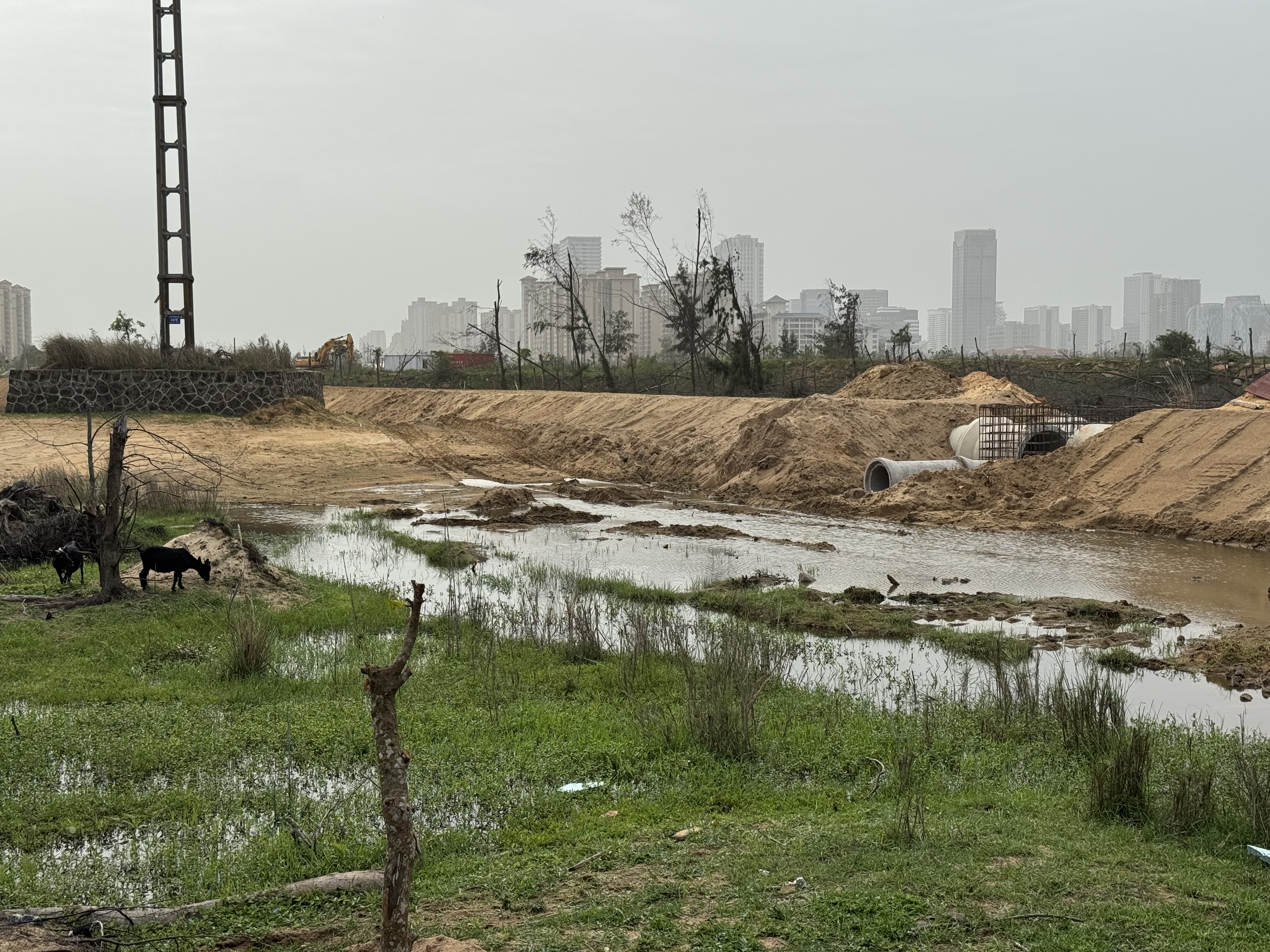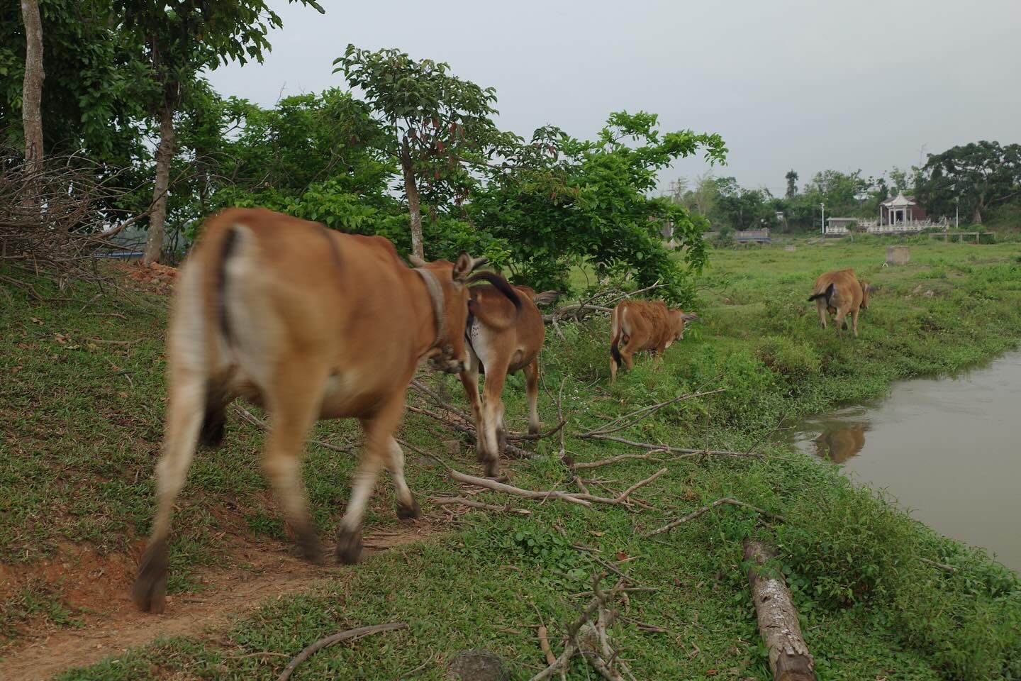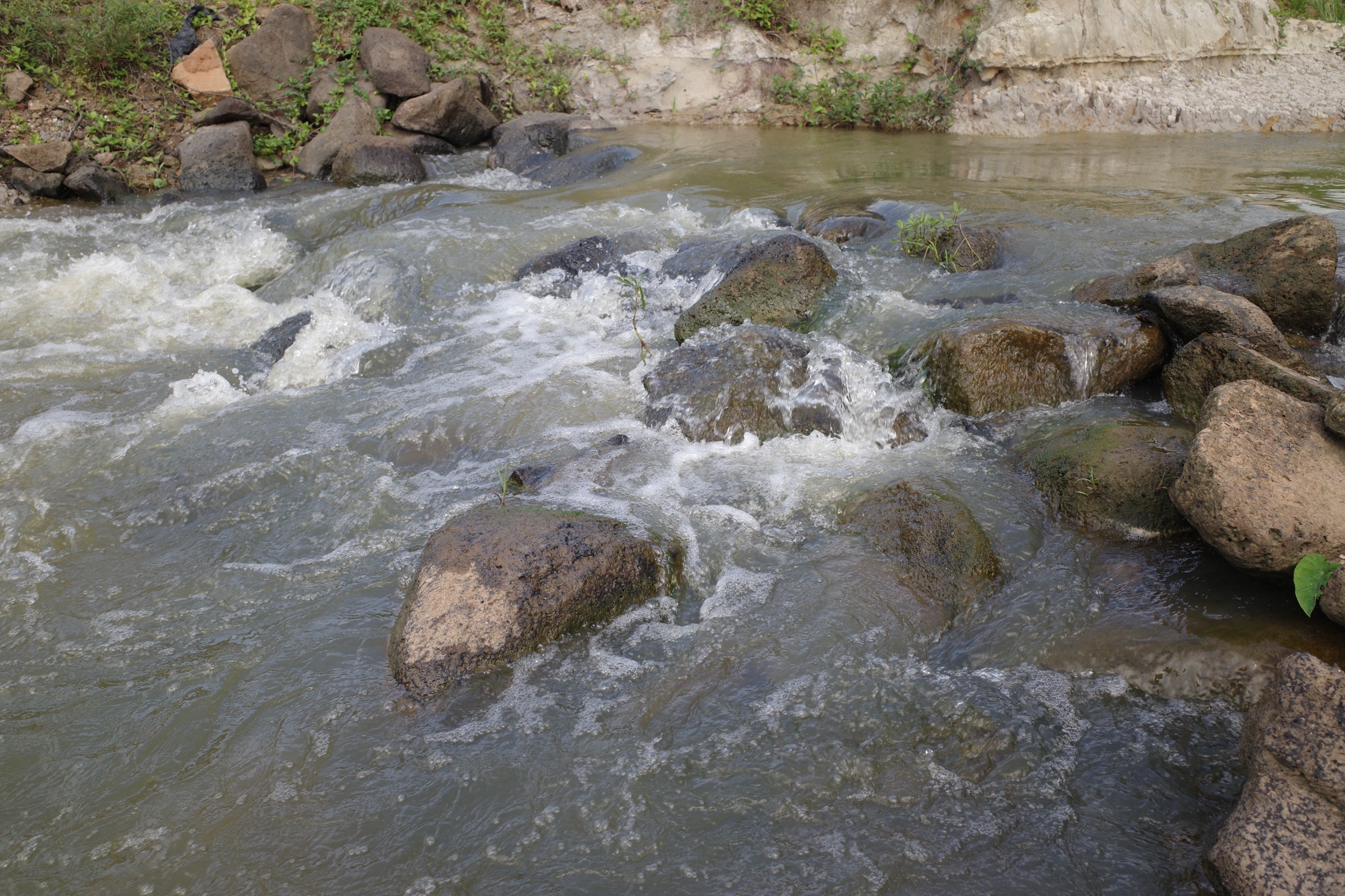 今天水位上涨,我可以到更高的地方去看一看,我顺着这个水攀上石头往前走。很好,这一片地方地底下都是石头,它有一定的躲藏区域。但不好的是,我闻到了人类的味道。我还闻到了牛的粪便的味道,它们都在旁边,它们距离我非常近。我有一点紧张,虽然我很想在这边吃到饱,但是这个位置有一点危险。