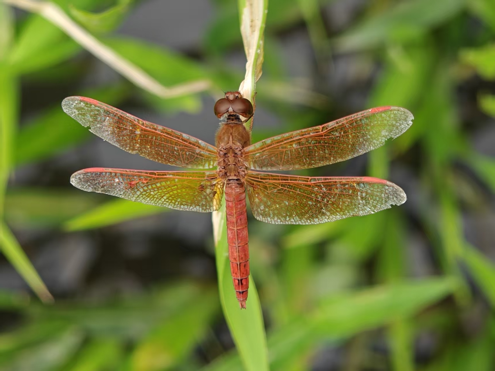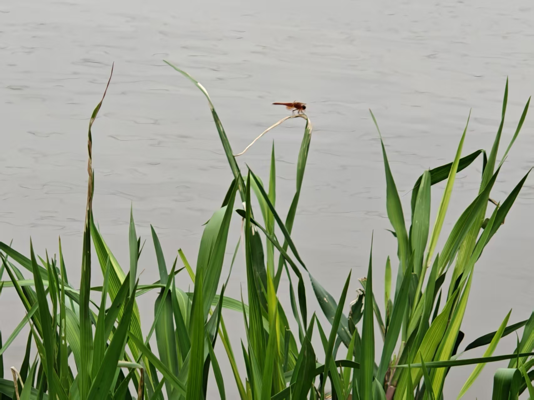 一只黄翅蜻停留在五源河下游堤岸的水草上。