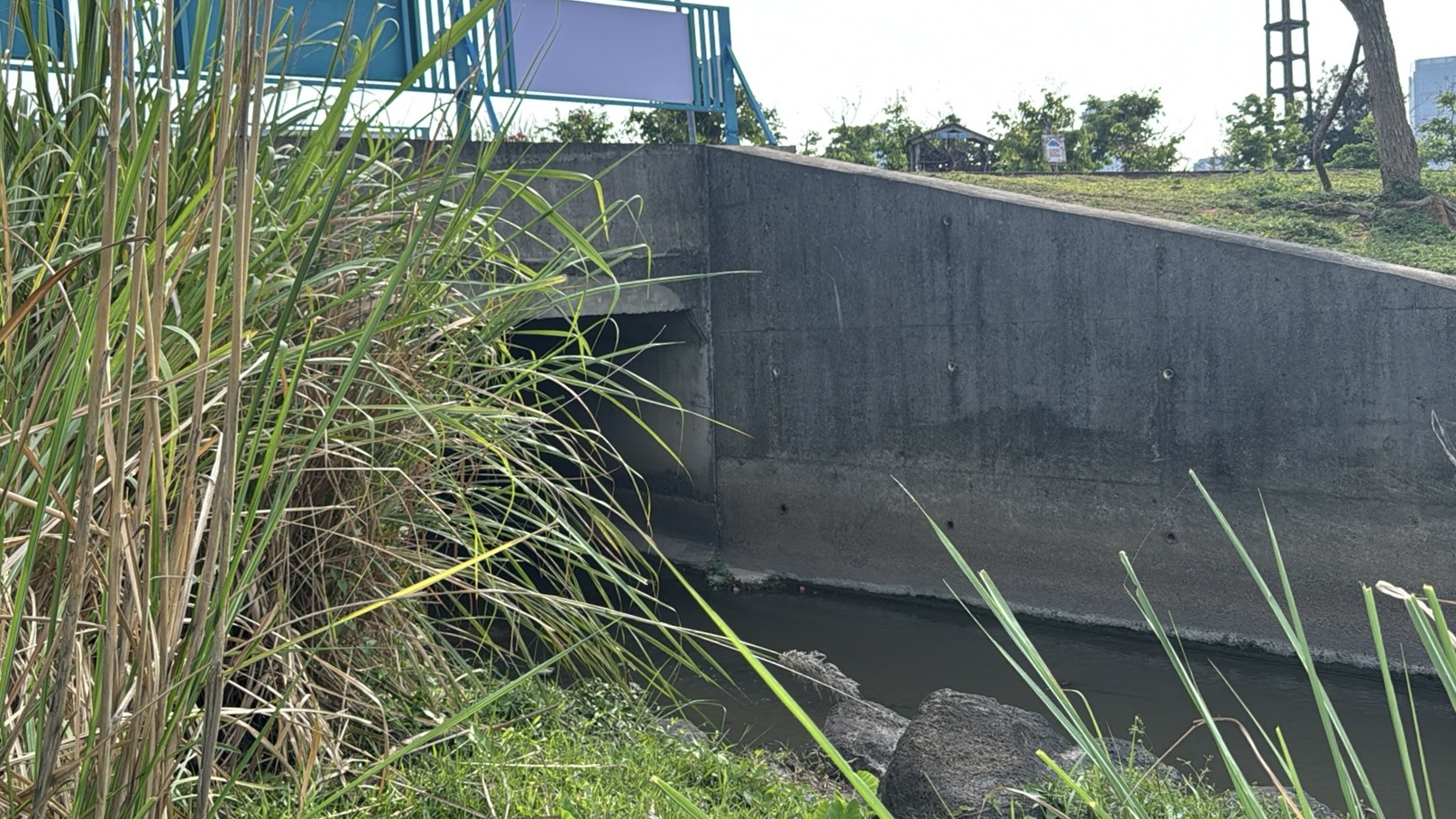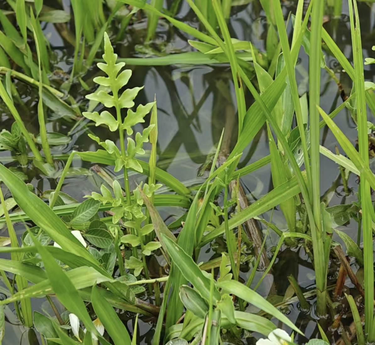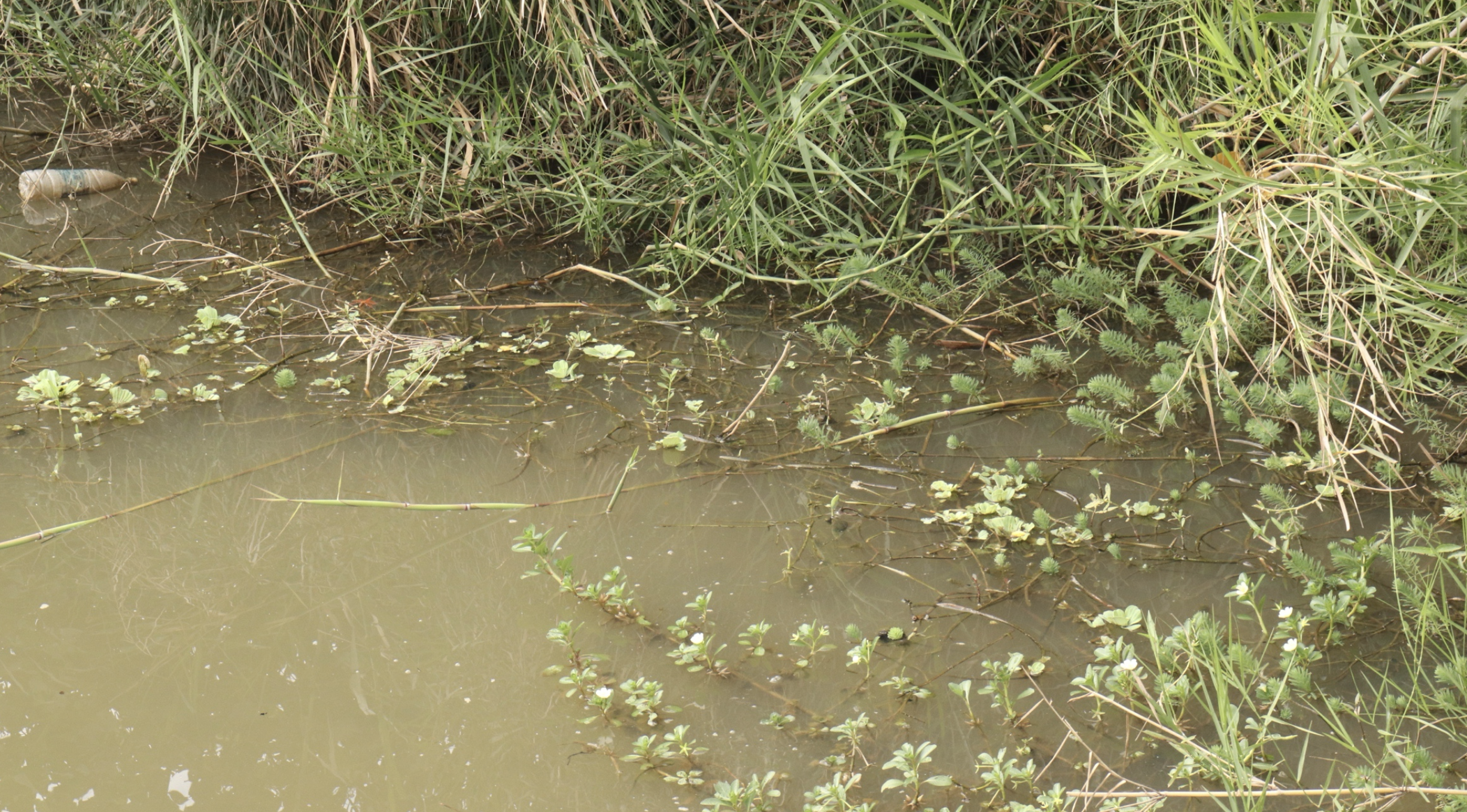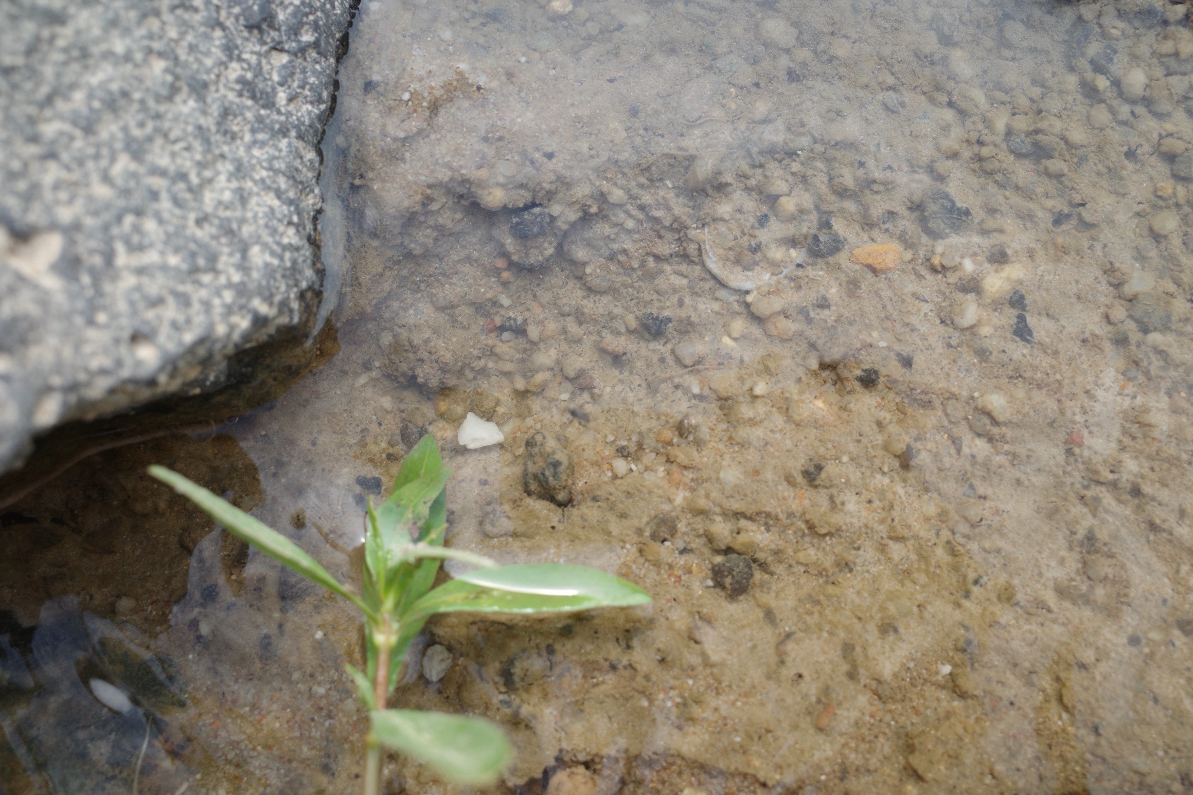 除了大部分淤泥的河滩,也有一些沙石地质的河滩。我主要在里面看到很多水草,成片的水龙,还有野芋。有遇到小鱼,还有一个钓鱼的人。