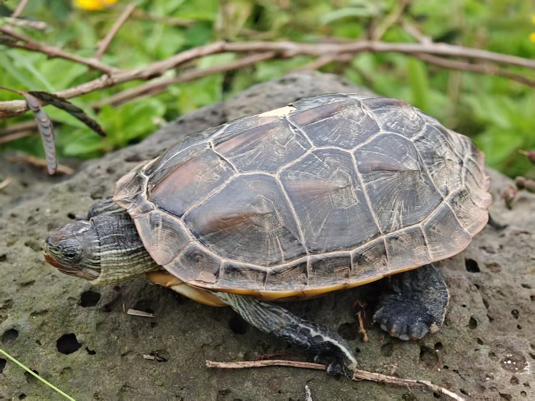还找到了红耳龟。像这些动物密集出现的地方,我感觉是流速应该是比较缓慢,植被特别茂密。像是对岸,植被长出来占据了水面的那些地方,可能比较适合形成这样的环境。它更适合植物的生长,也更适合动物的生长。
