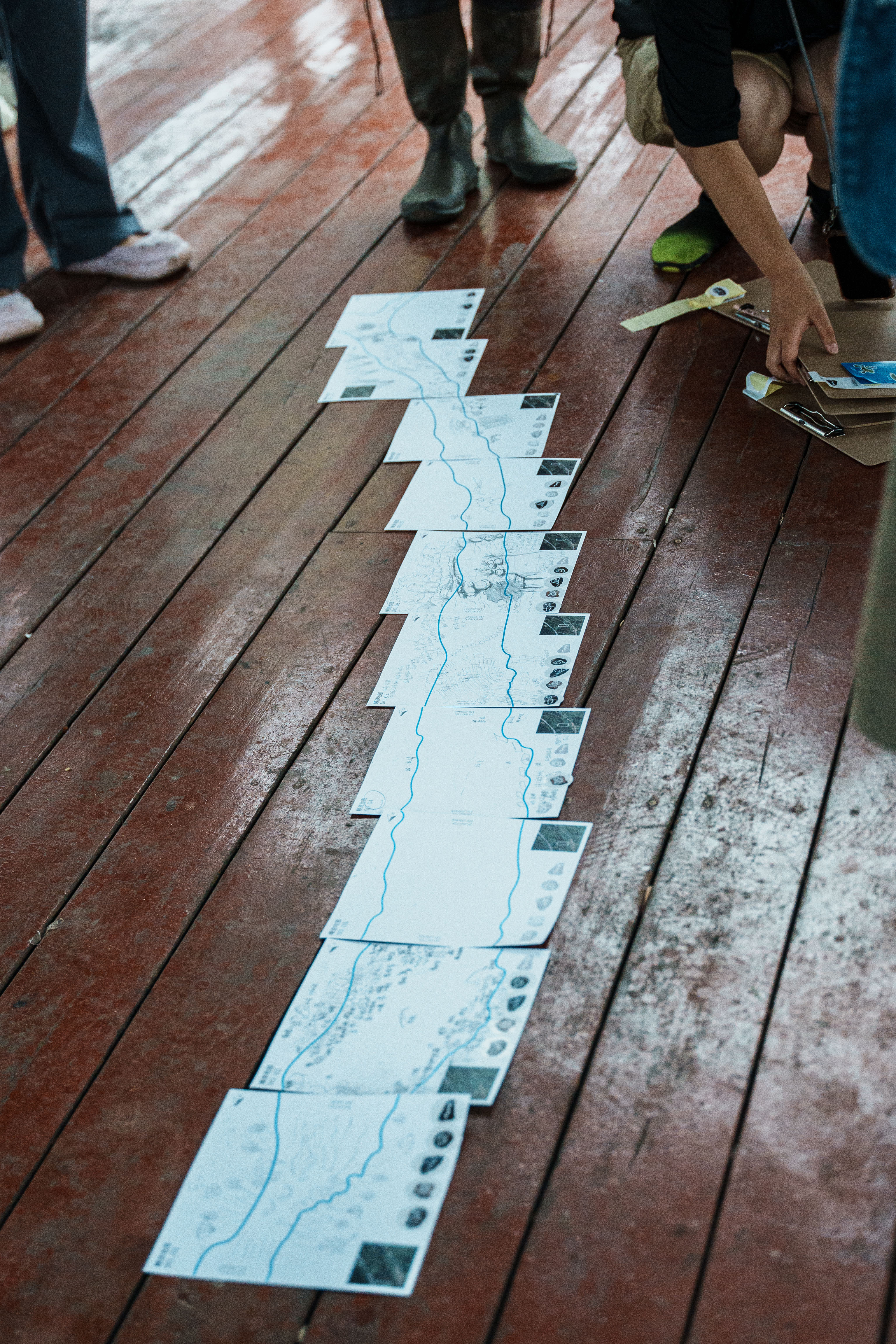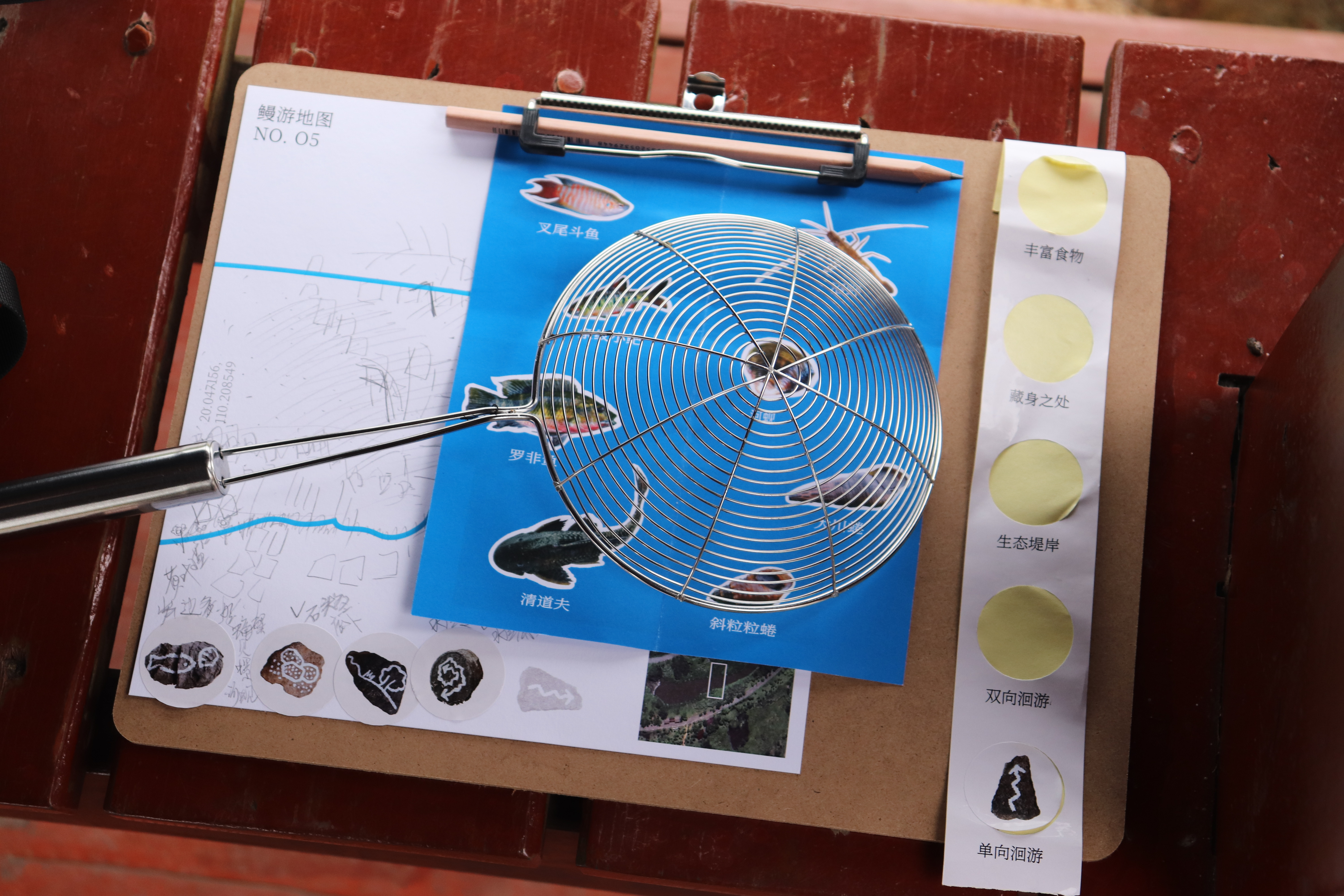 鳗鱼漫游工具包。包括漏勺、相应河段点位的河流地图、常见生物图鉴和鳗鱼漫游指标贴纸。