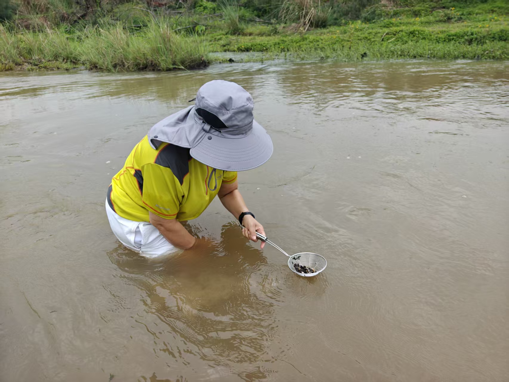 然后在捞的过程中发现,这里虽然一个小小的河段,底下的碰到的东西很不一样的,有大的岩石,有碎石,有沙、有泥沙,还有淤泥。