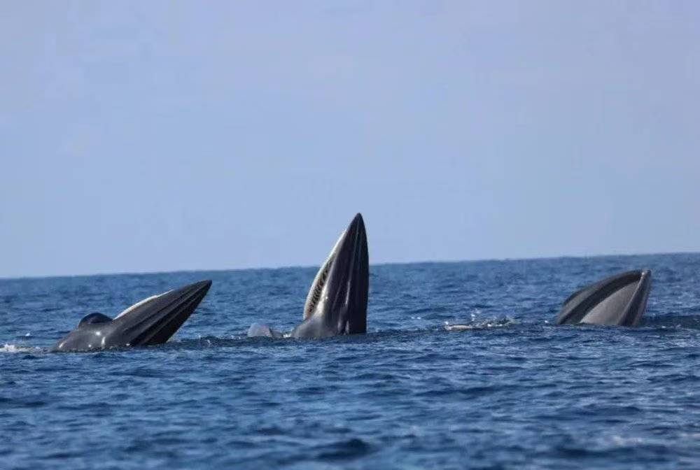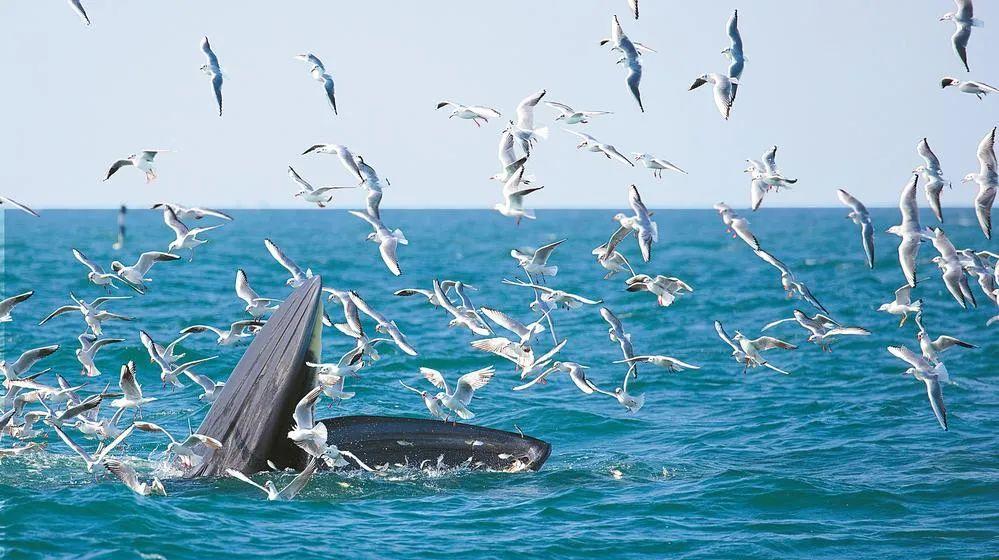 布氏鲸在海面捕食,吸引海鸟前来分一杯羹: