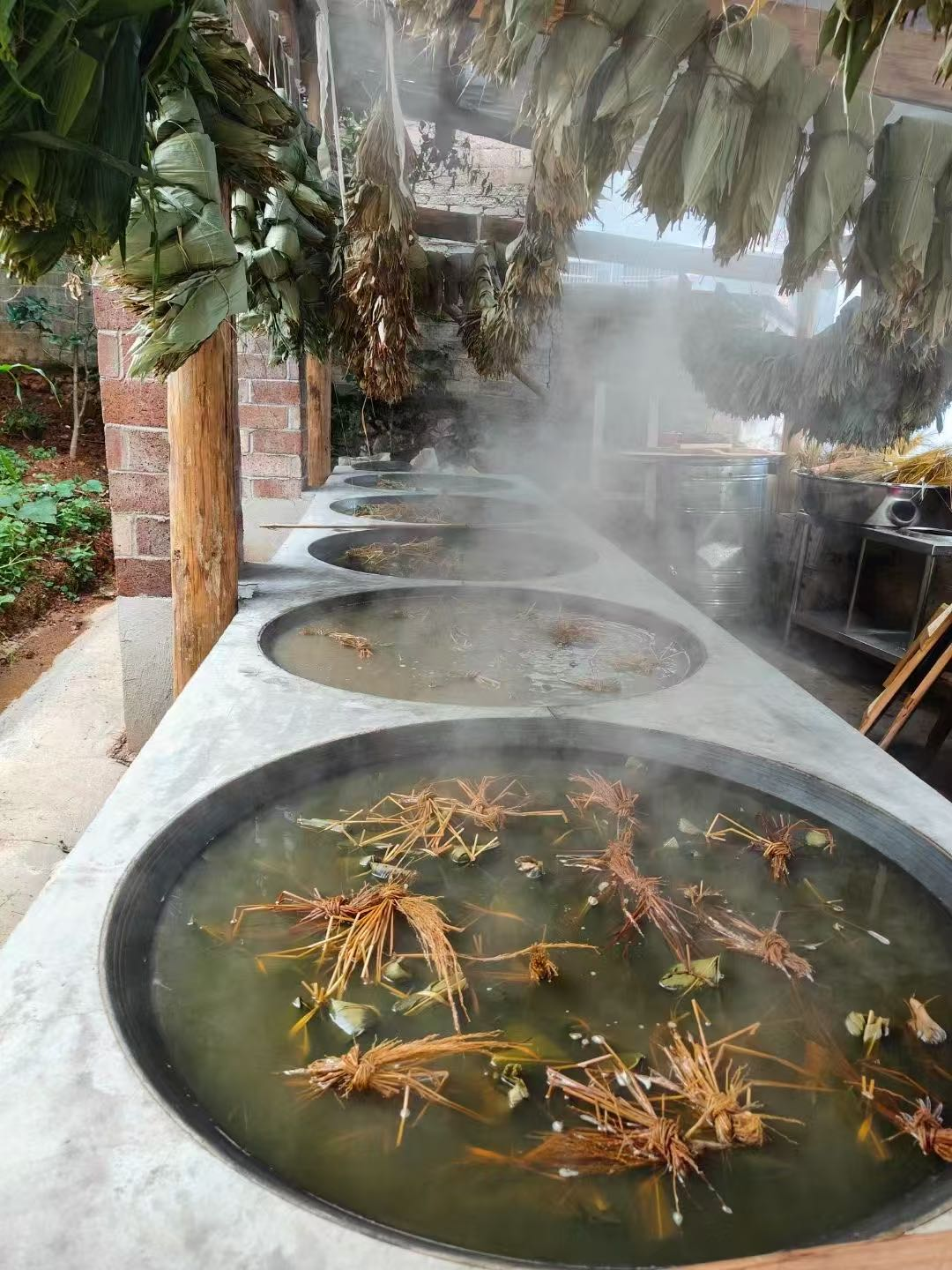 我们的稻灰粽独具风骨。选香禾糯稻杆烧制的草灰,其咸碱之味与稻米的甘润、粽叶的清芬相互激发,在柴火灶上历经6小时慢炖,糯米吸饱草木清香,化作紧实弹牙的「粑状」粽体,入口软糯中带着嚼劲,放凉后更添清爽。