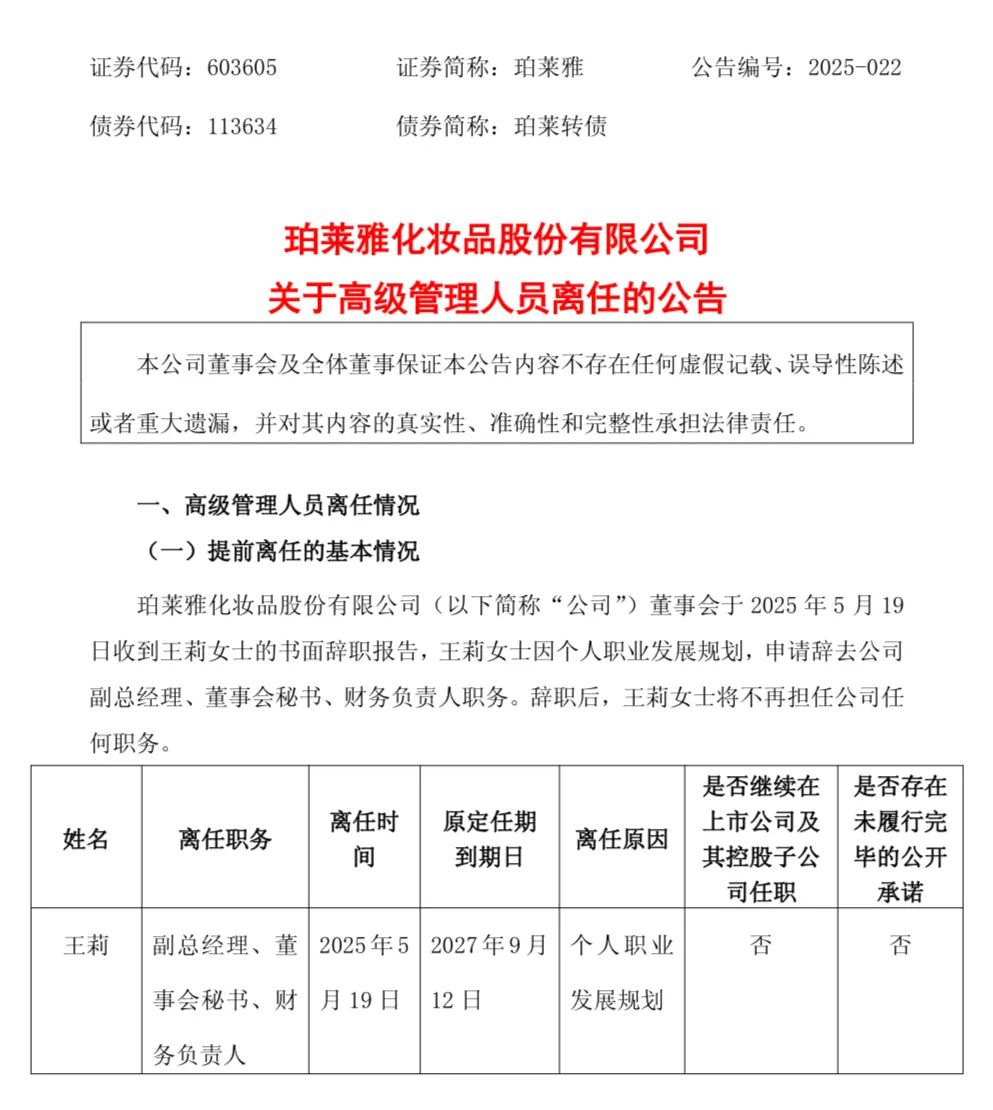 - 在美妆行业的江湖里,高管人事变动从来不是孤立事件,而是「企业战略调整」的晴雨表。5 月 19 日晚,珀莱雅发布公告,副总经理兼董事会秘书「王莉」离任,这一消息在行业内引发广泛关注。结合 2024 年全球美妆行业超 143 起高管变动案例,在节目的最后,我们来「深度拆解」换帅背后的行业逻辑。