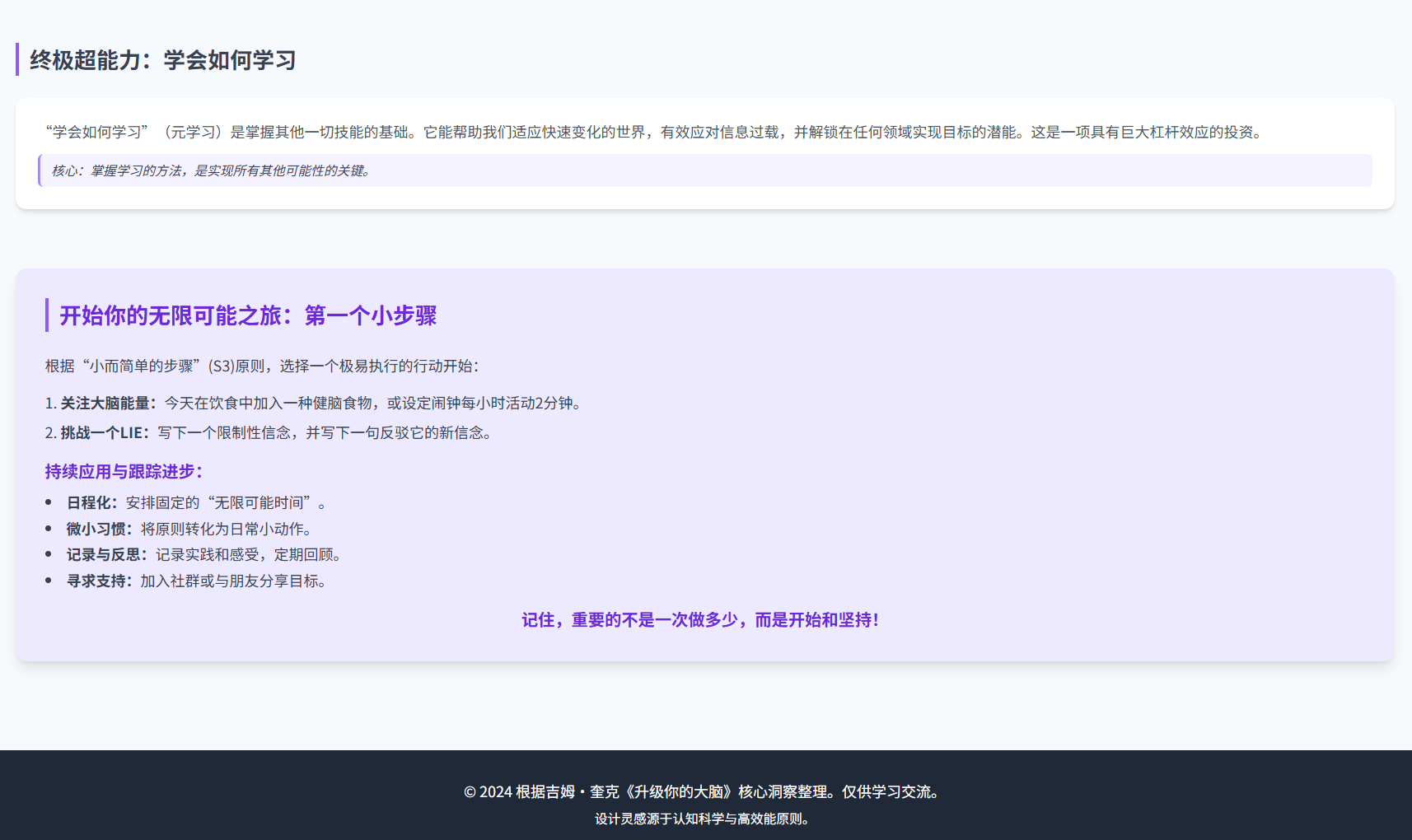 是一本名为《无极限》的书的节选,作者是吉姆·奎克。这本书提供提升大脑、更快学习任何事物的方法。作者分享了他的个人经历,包括童年脑损伤以及学习困难,这促使他探索如何学习。这本书的核心思想是,人类的潜力是无限的,而限制我们的主要是我们的信念;通过改变心态和方法,我们可以克服这些限制,成为自己故事中的英雄。书中有具体的方法和练习,旨在帮助读者提高记忆力、阅读速度、专注力和思维能力。