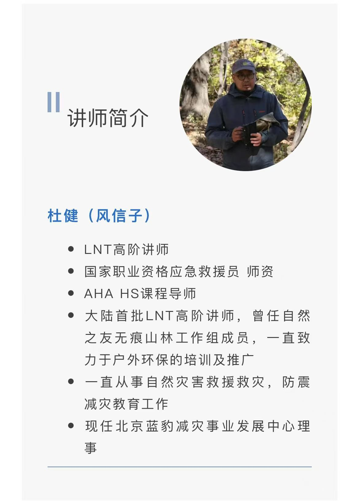 LNT (Leave No Trace),无痕山林,是始于美国的一种户外运动方式,旨在提醒人们在自然中活动时,关注并身体力行地保护与维护当地的生态环境。成为一名LNT讲师,就意味着获得了美国NOLS(户外领导力学校)LNT中心的认证。2007年,中国台湾林务局将无痕山林户外伦理中心的课程引入台湾。2011年,这一理念被引进中国大陆。同年,自然之友公益组织培训出了中国大陆第一批“无痕山林”LNT初阶讲师。风信子老师,杜健,便是其中一位。