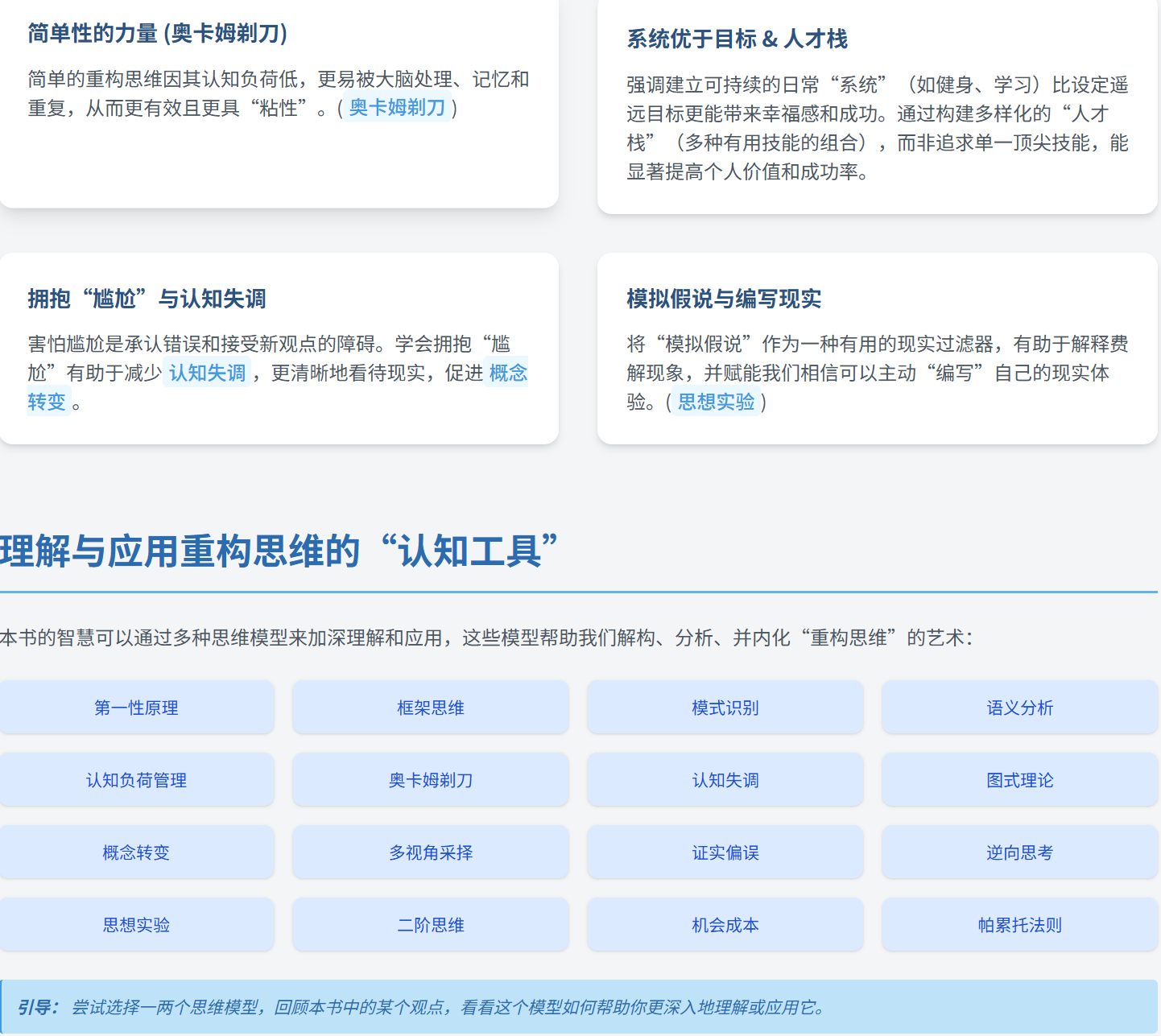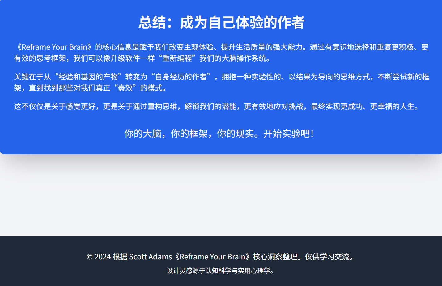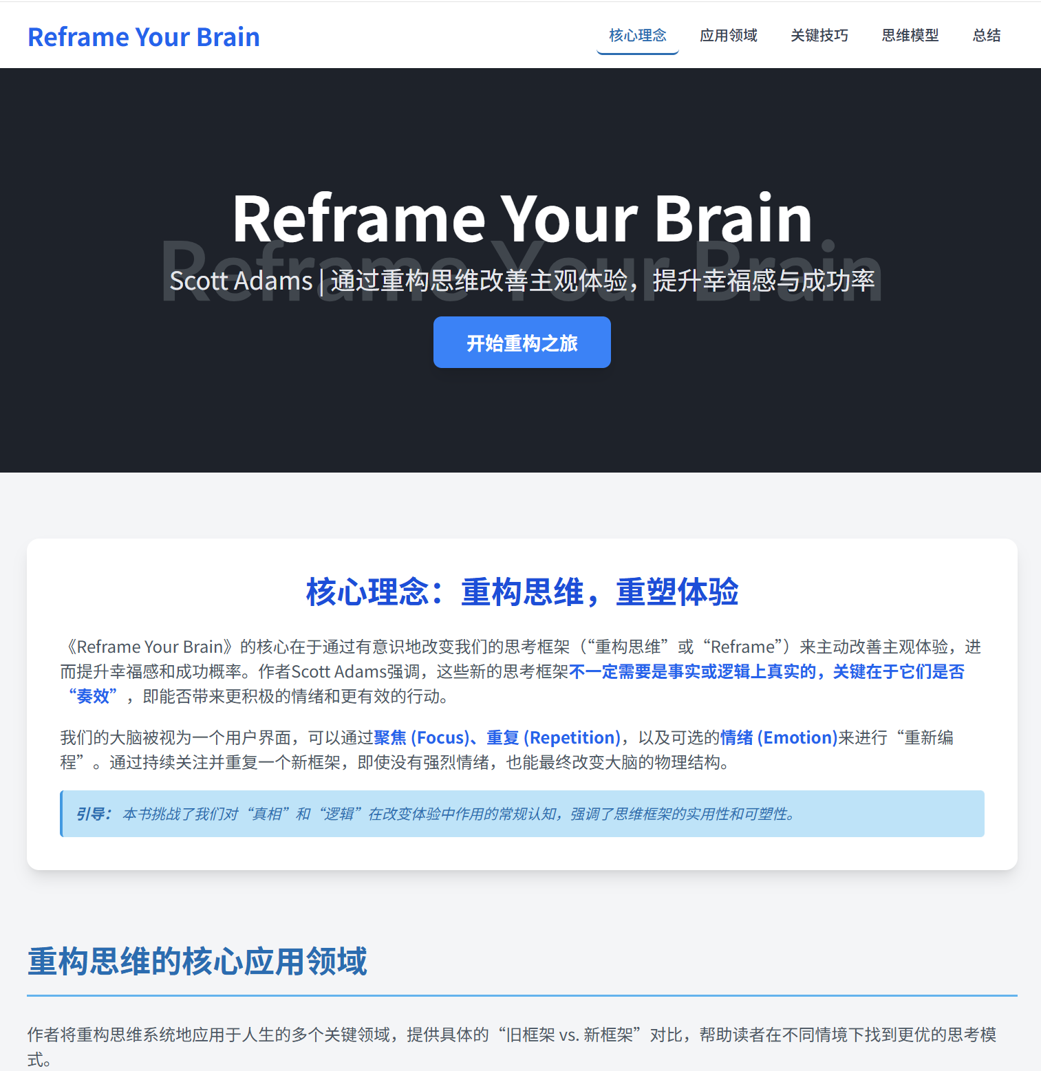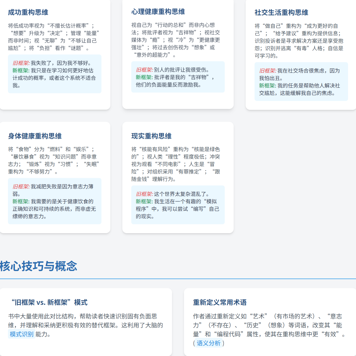 《重塑你的大脑:幸福与成功的用户界面》的书摘,由斯科特·亚当斯和约书亚·利塞克合著。本书的核心理念是通过改变思考方式或“重塑”(Reframe)来提升幸福感和获得成功,作者认为这些新的思考框架比逻辑或真相更重要,只要它们有效。书摘中包含了作者分享的多种重塑方法,涵盖了个人成长、社交互动、应对问题、管理情绪以及理解现实等多个方面,旨在帮助读者用更有效的心态去面对生活中的挑战。