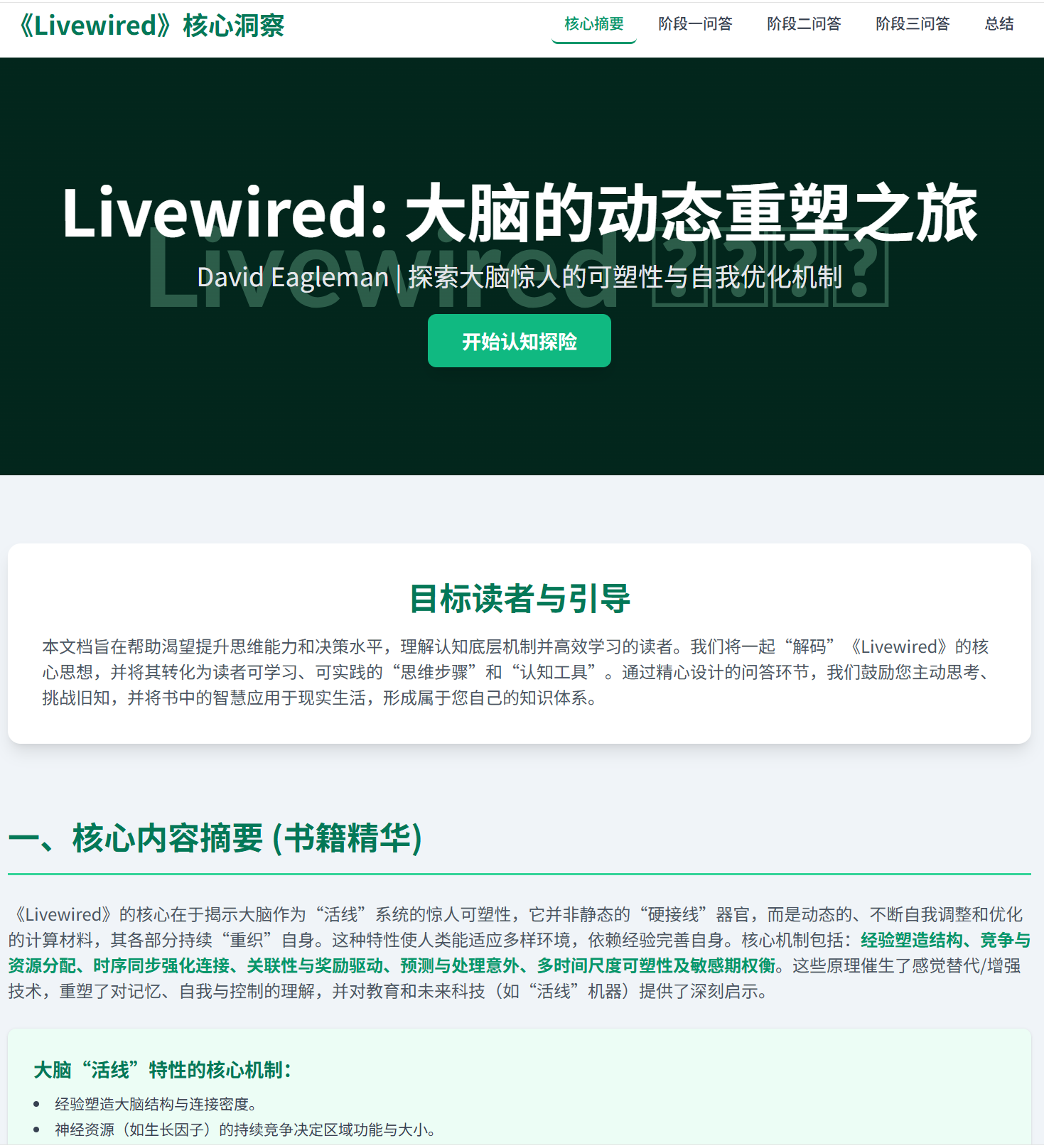 大卫·伊格尔曼的著作《活线:不断变化的大脑内部故事》。这本书探讨了大脑的可塑性,强调它是一个动态系统,通过经验和环境不断重塑自身。书中通过案例研究、实验和神经科学概念,说明大脑如何适应身体的变化、学习新技能以及感知世界,并讨论了大脑的可塑性如何影响记忆、知觉和自我意识,甚至展望了我们未来通过技术扩展感官和能力的潜力。