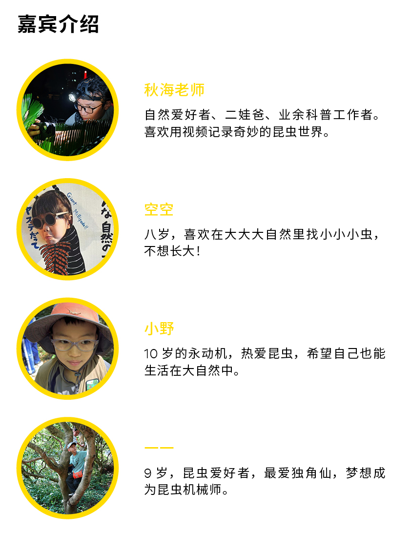人们久居城市中,提起昆虫往往避之不及,但对纯真的小朋友们而言,昆虫却是童年最好的自然导师。它们的颜色纹理、铠甲触角,是城市里最生动的自然教育。在本次聚体行动为儿童节做的特别企划中,昆虫爱好者秋海老师与三位上海的小小虫友——空空、小野、一一,带来一场关于好奇心、饲养趣事与生命敬畏的对话。从远在海外的大蓝闪蝶到身边时常可见的菜粉蝶,孩子们用最童真的视角为大家讲述他们与昆虫的交集。