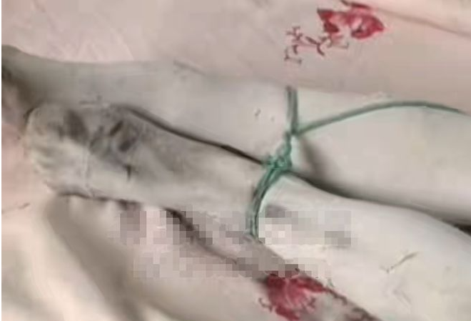 图为捆绑赵吕臻双脚的绿色绳索