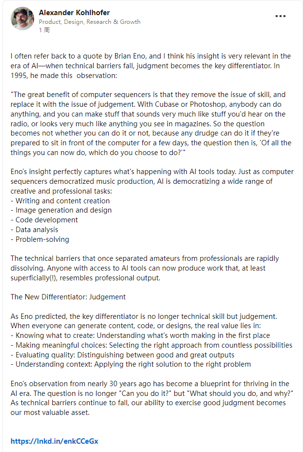 这篇《AI and the Rise of Judgement Over Technical Skill》文章从一开始便引用了 Brian Eno 早在 1995 年对计算机作曲器(computer sequencers)的观察:随着技术门槛的降低,判断力(judgement)将取代传统“技术熟练”成为创作与产品差异化的关键。“任何人只要肯坐在电脑前几天,都可以做出听起来像广播里、看起来像杂志里东西”的论断,被作者映射到当下 AI 工具的普及:无论是文字、图像、代码,还是数据分析,技术壁垒正在迅速消解,人人都能生成“看似专业”的成果。作者由此得出“真正的价值在于判断:你要做什么、如何做、如何评估成果”,强调当技术不再稀缺时,优劣的区别在于能否做出合乎目标与语境的明智选择。