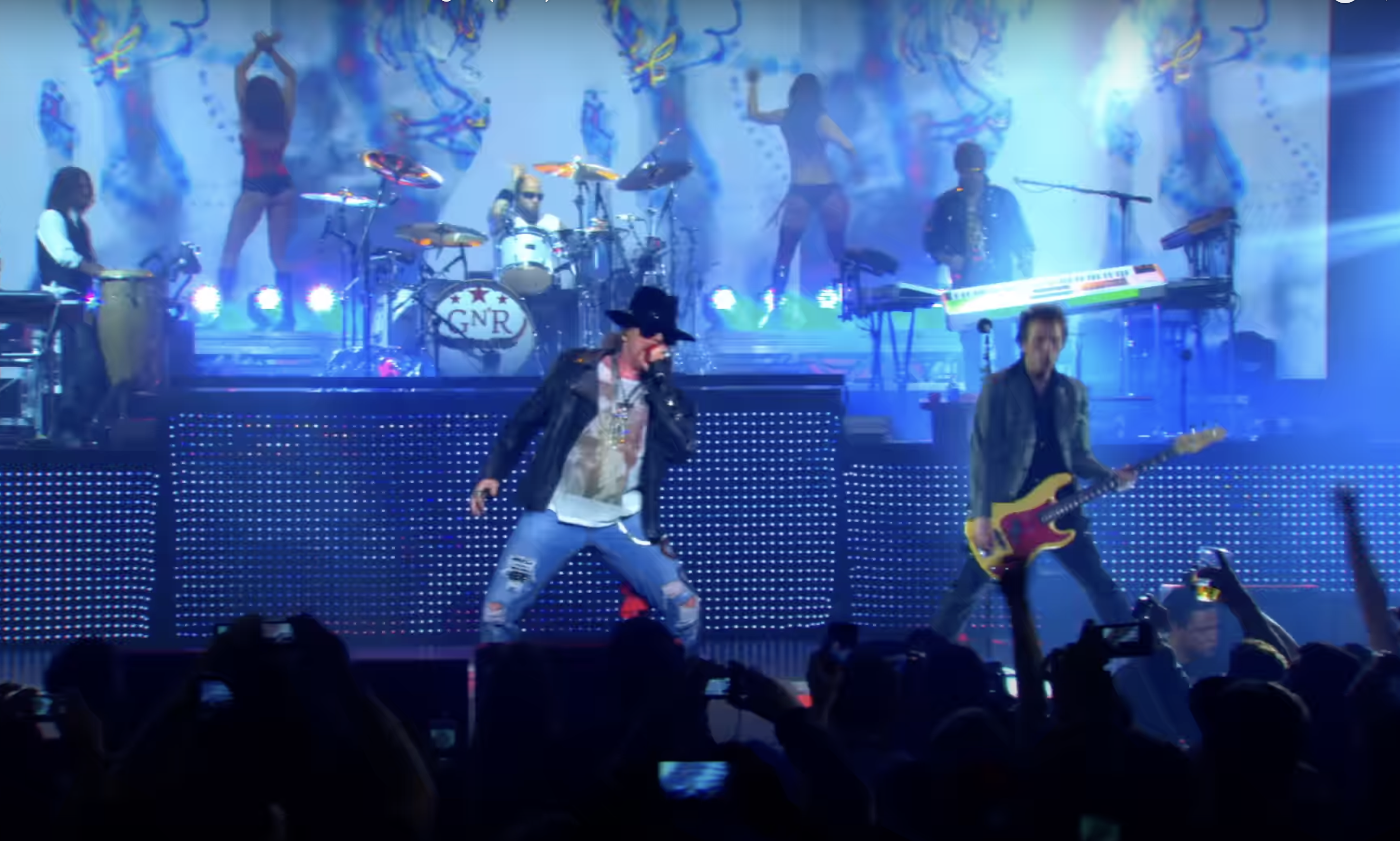 枪与玫瑰(Guns N' Roses)是1985年成立于洛杉矶的美国硬摇滚乐队。他们的音乐融合了硬摇滚、布鲁斯和朋克元素,他们也被称为“硬摇滚传奇”。此外,乐队以充满能量的现场表演和独特的音乐风格著称,因此获得了“世界上最危险的乐团”这一称号。在演唱会上,枪炮与玫瑰以充满能量的现场表现和精湛的乐器演奏著称。史莱许的吉他独奏常常成为全场焦点,而艾克索·罗斯以其高亢的嗓音和独特的舞台魅力吸引观众。