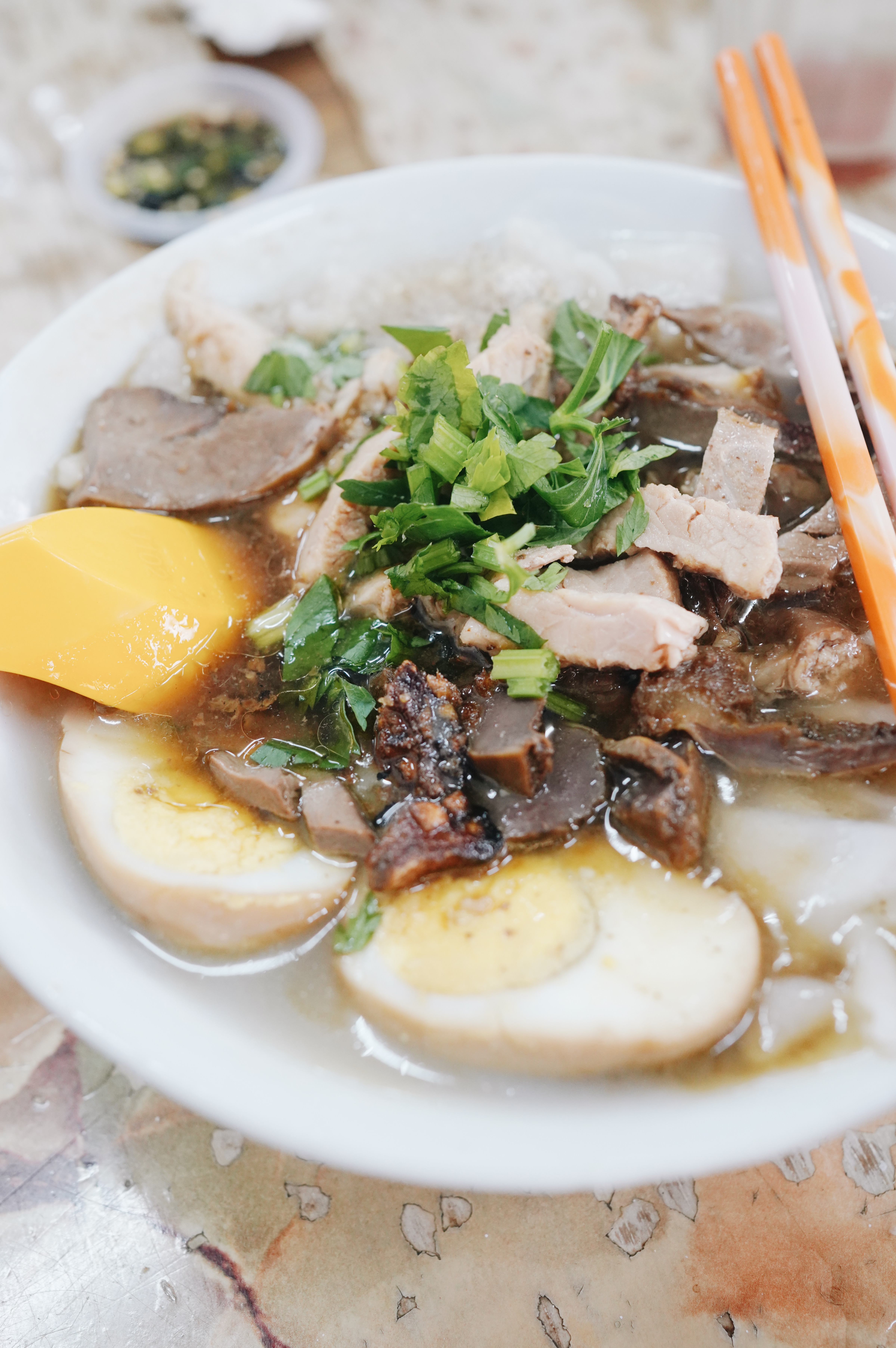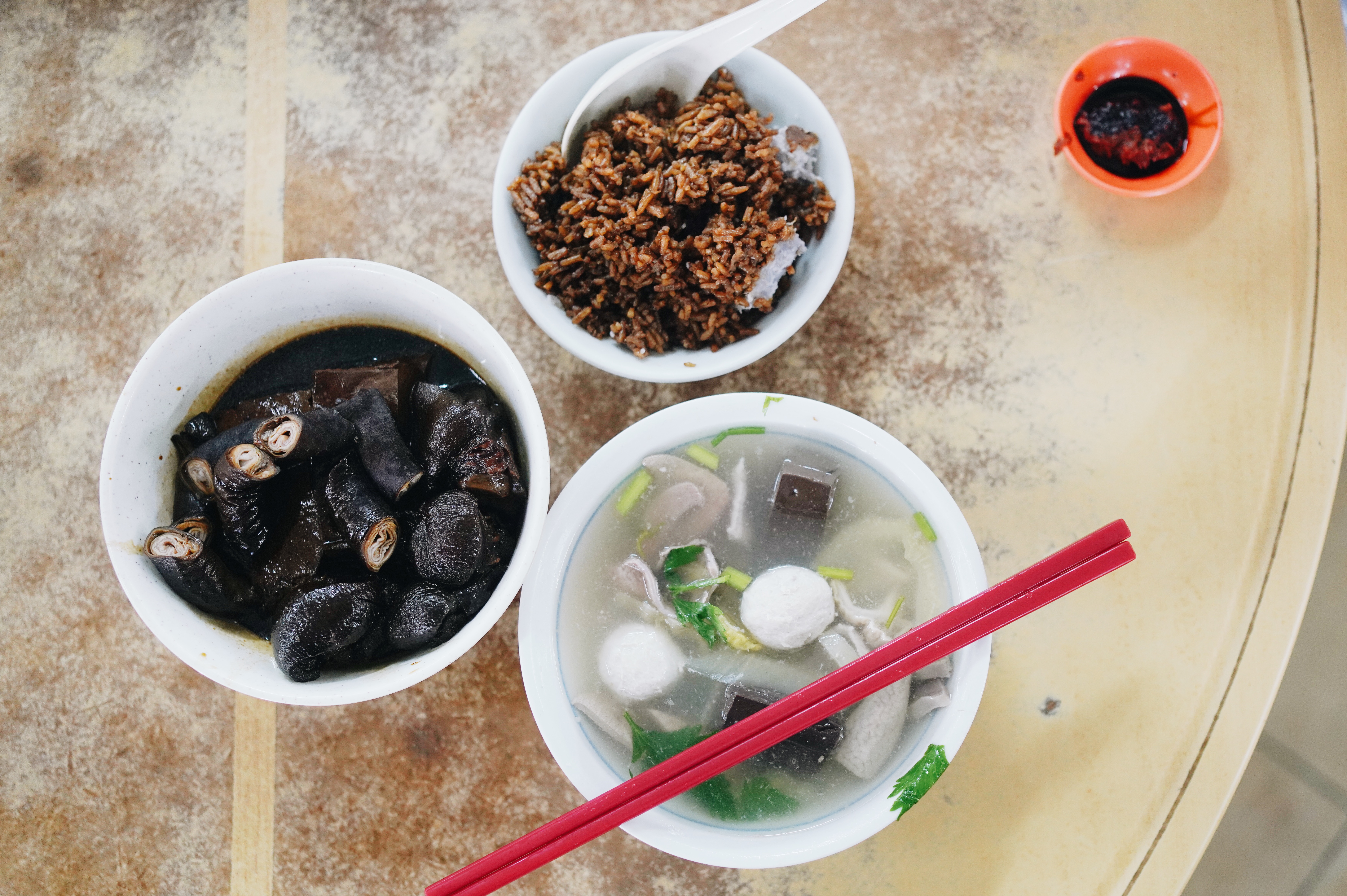- 圣淘沙 Corner 里,我们点了芋头饭 + 卤猪脚+卤小肠 + 卤豆腐 + 猪杂咸菜汤,迷人三件套!