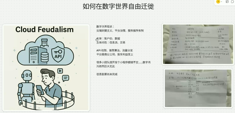大家好,欢迎收听新一期SeeTalk。本期内容是SeeDAO第11届节点共识大会(2025.5.30-2025.5.31)上的,第一天的线上内容回放。白鱼分享主要是三个大主题,1.对数字世界现状的阐述,重点介绍数字世界的“云端封建主义”。2.SeeDAO过去几年在Web3世界探索和反思。3.SeeDAO后续发展的一些方向。