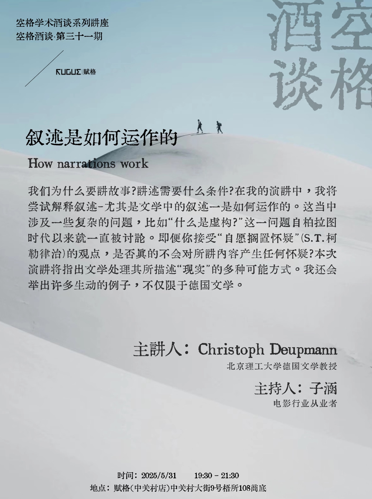 我们为什么要讲故事?讲述需要什么条件?在我的演讲中,我将尝试解释叙述-尤其是文学中的叙述一是如何运作的。这当中涉及一些复杂的问题,比如“什么是虚构?”这一问题自柏拉图时代以来就一直被讨论。即便你接受“情感的自愿悬置”(S.T.柯勒律治)的观点,是否真的不会对所讲内容产生任何怀疑?本次演讲将指出文学处理其所描述“现实”的多种可能方式。我还会举出许多生动的例子,不仅限于德国文学。主讲人:Christoph Deupmann北京理工大学德国文学教授主持人:子涵 电影行业从业者