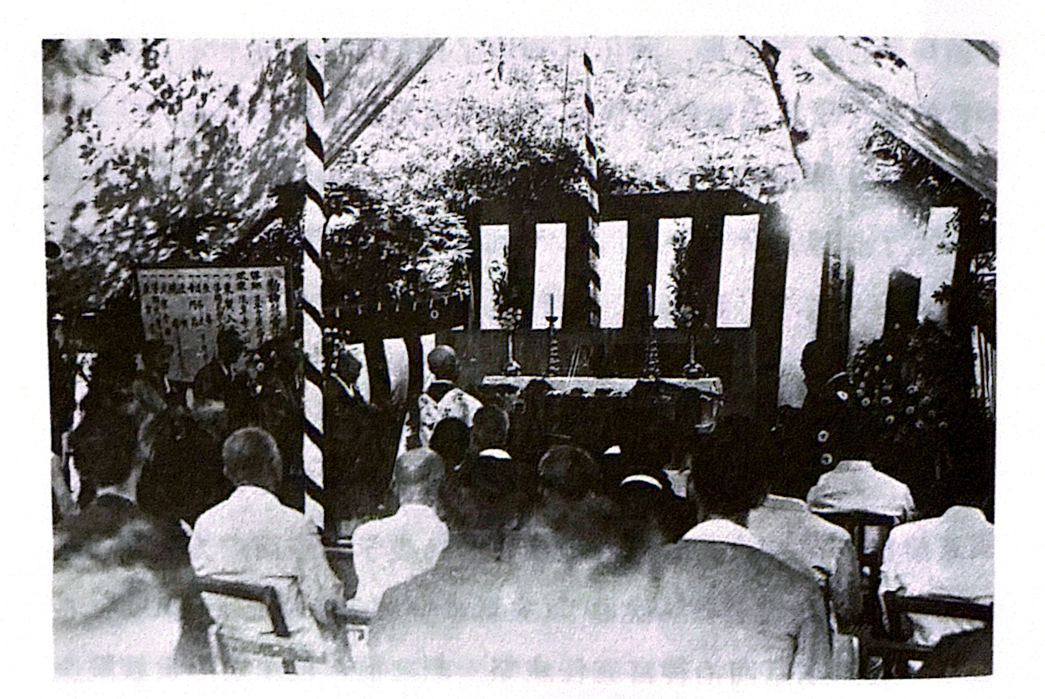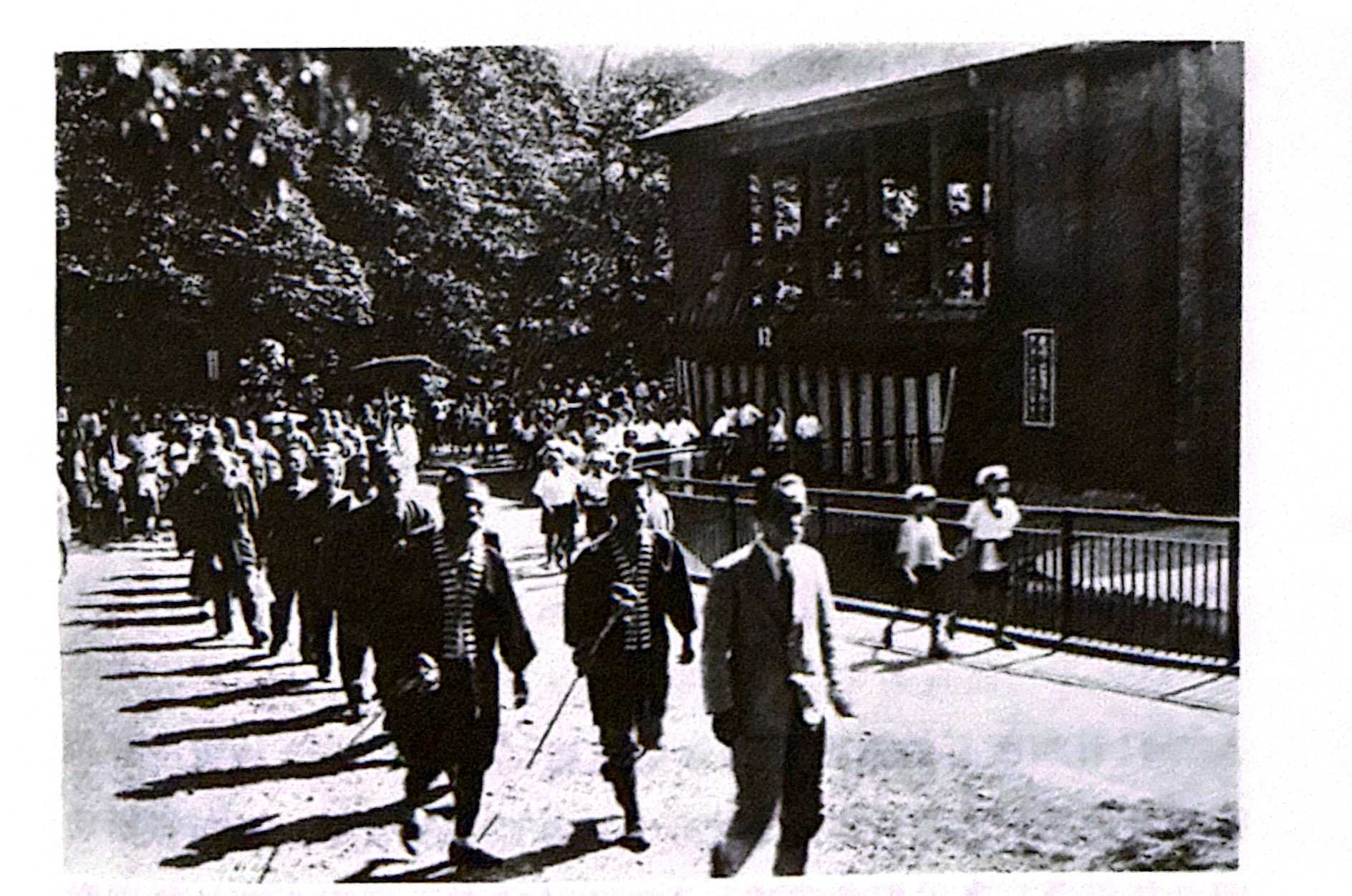 领头人大达茂雄,当时的两头大象正坐在背景的红白条纹布后等待死亡