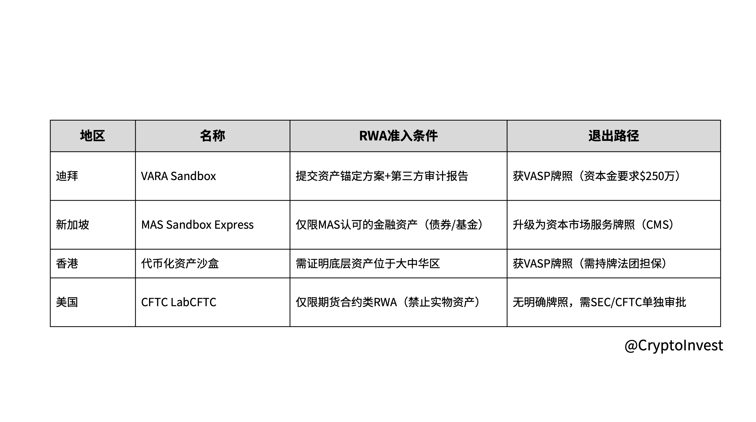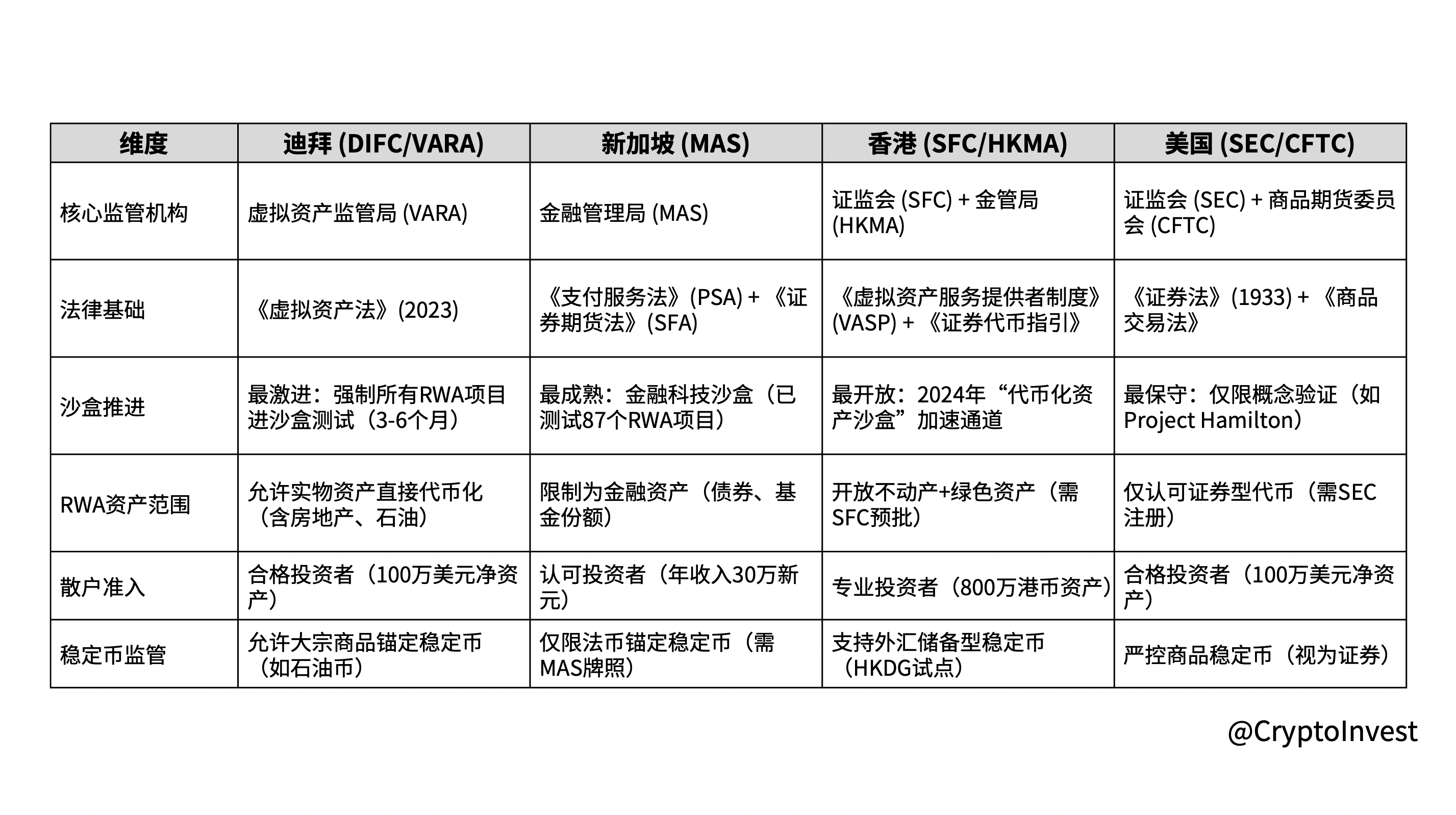 地区准入资产散户门槛沙盒政策香港不动产+绿色资产300万港币资产代币化资产沙盒新加坡债券/基金份额年收入30万新元MAS沙盒迪拜房地产/石油100万美元净资产强制沙盒3-6月美国证券型代币100万美元净资产无明确路径