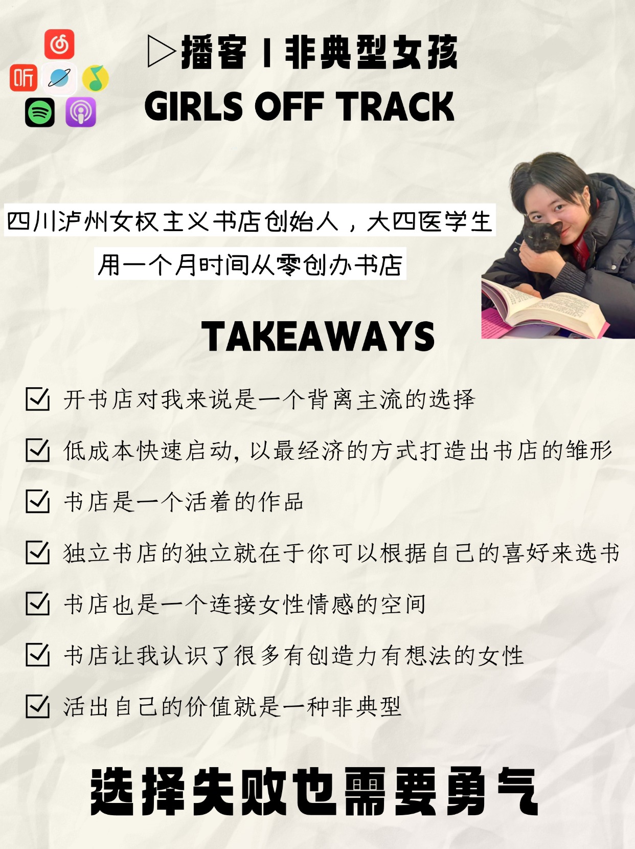 在本期播客中,西西分享了她作为一名医学生,如何在大学期间开设女权书店的故事。尽管面临家庭和社会的很多压力,但她还是展现了她超强的行动力,从产生想法到开业仅用一个月,低成本快速启动, 以最经济的方式打造出书店的雏形。