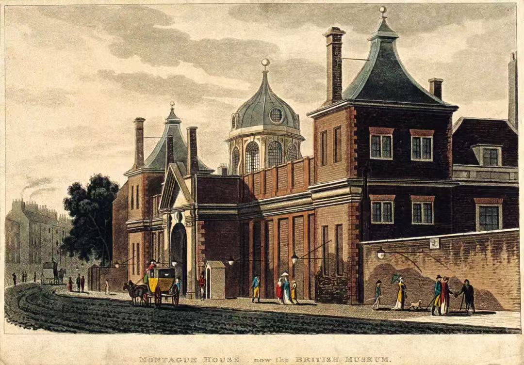 大英博物馆原址——蒙塔古大楼,鲁道夫·阿克曼《大英博物馆外的街景》,约1810年,石版画,采自《阿克曼的知识库》