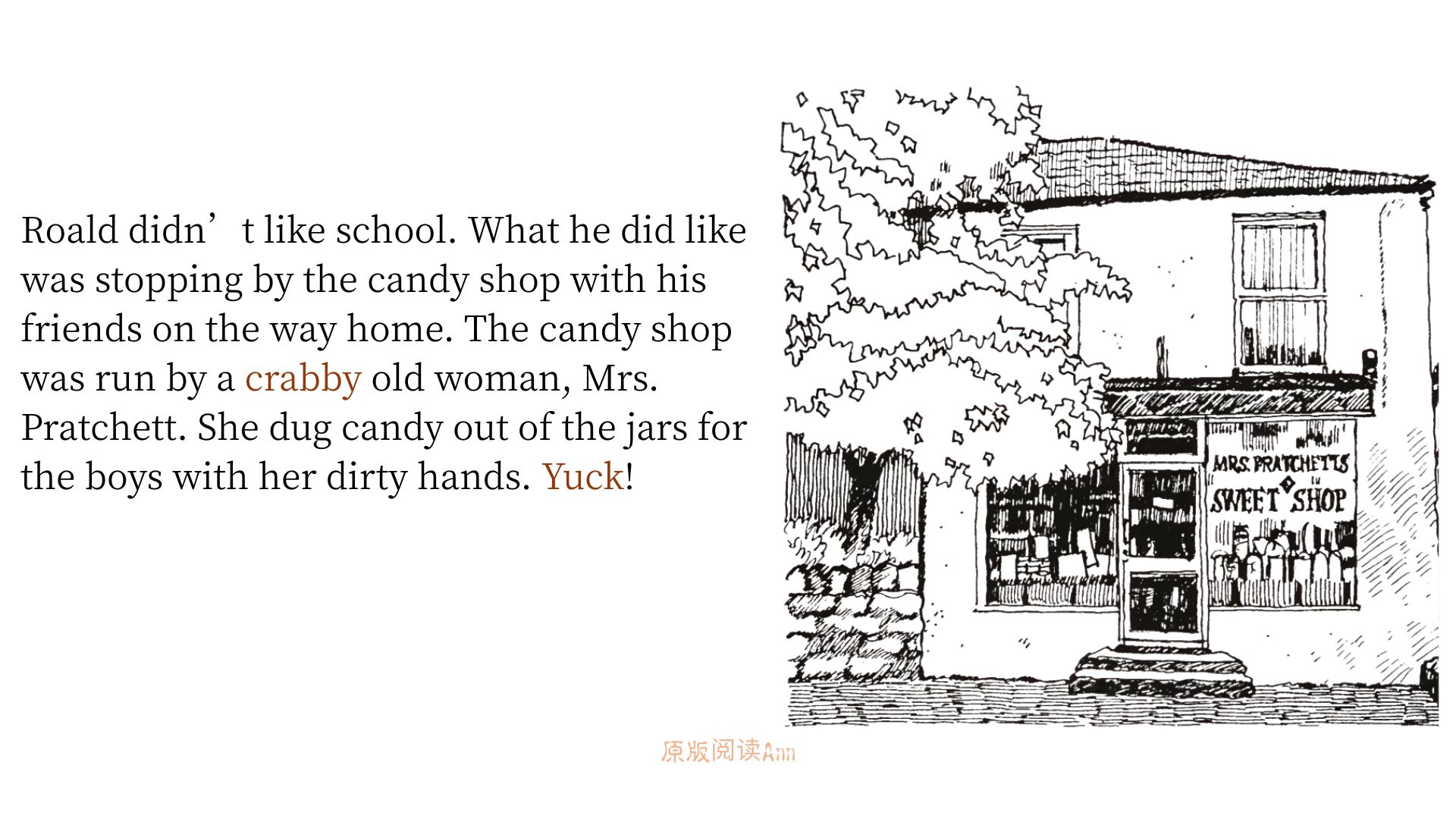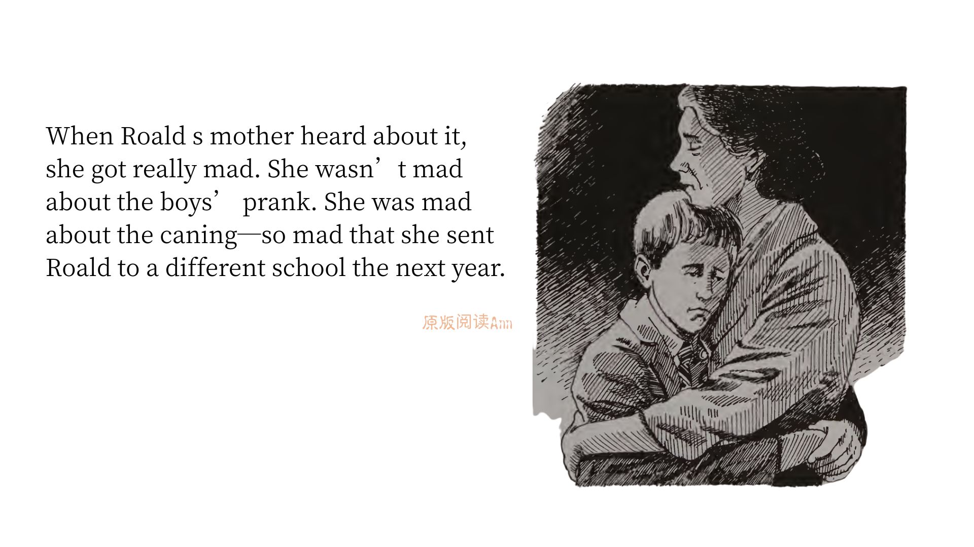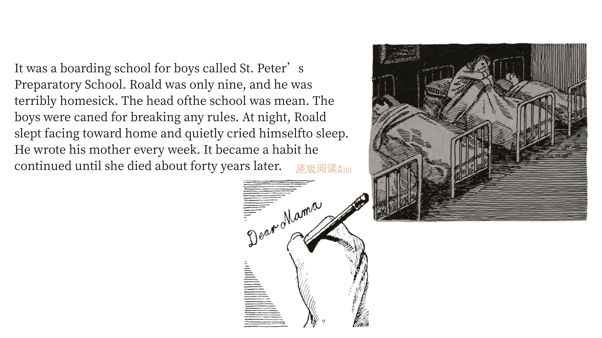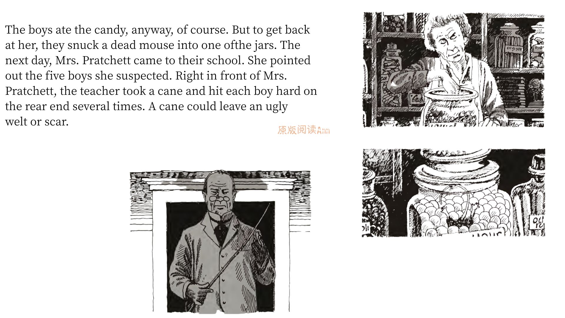 适合英文水平:高中/大学ATOS:4.6重点词:nosy多管闲事的;crabby易怒的,脾气坏的;cane藤条;welt鞭痕;rear end臀部;prank恶作剧行为;boarding school寄宿制学校。
